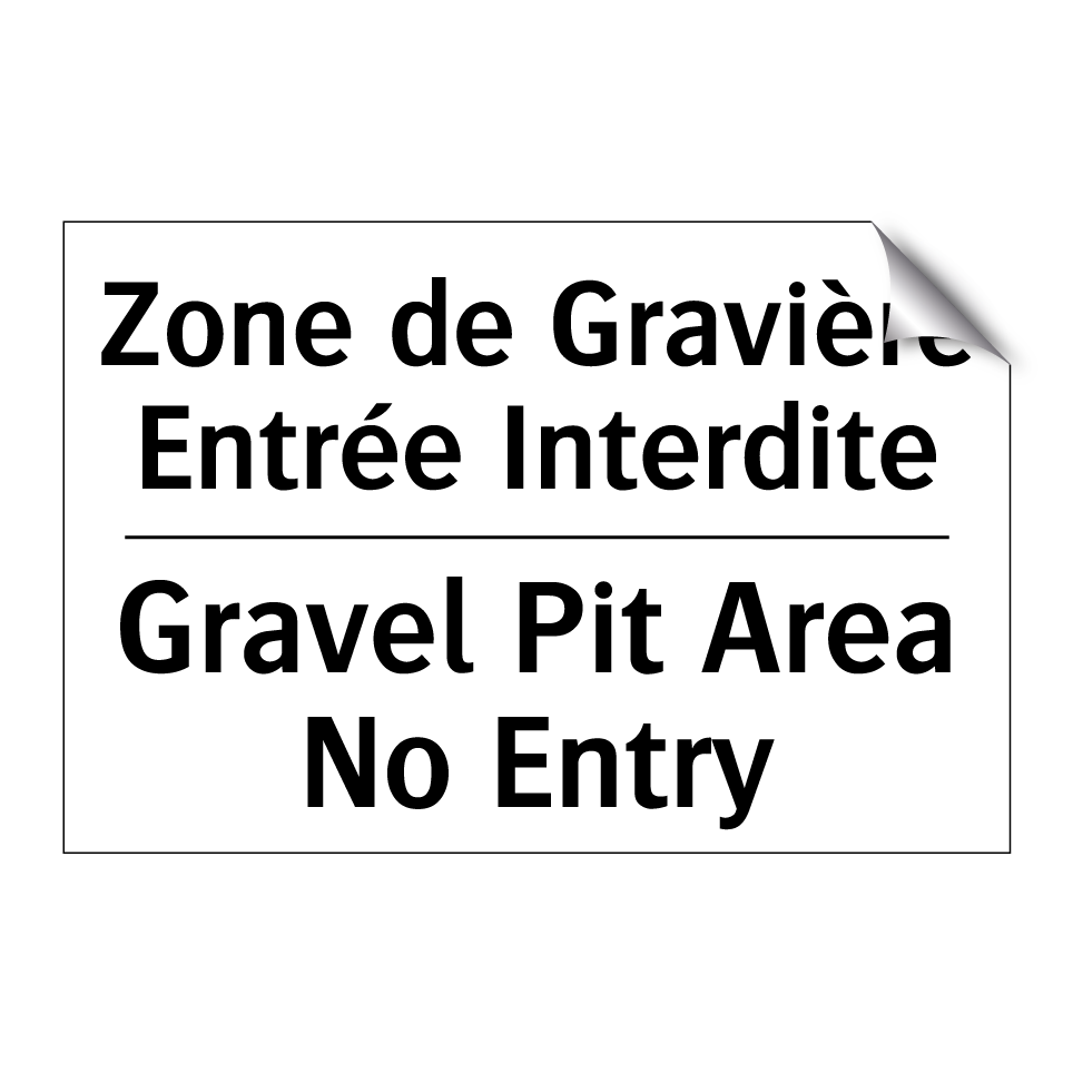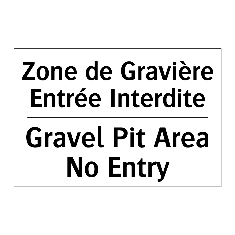 Panneau d'interdiction bilingue avec texte en français : "Zone de Gravière Entrée Interdite", et en anglais : "Gravel Pit Area No Entry"