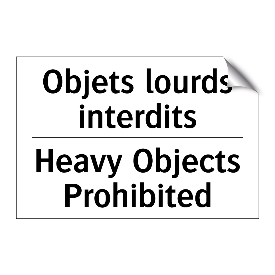 Panneau d'interdiction bilingue avec texte en français : "Objets lourds interdits", et en anglais : "Heavy Objects Prohibited"