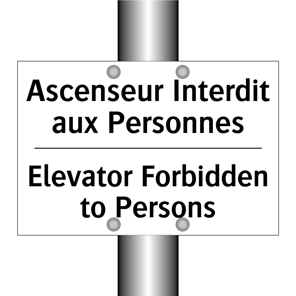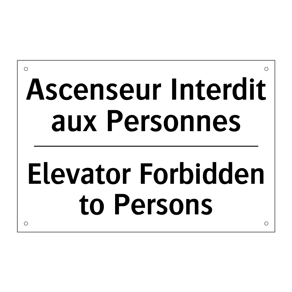 Panneau d'interdiction bilingue avec texte en français : "Ascenseur Interdit aux Personnes", et en anglais : "Elevator Forbidden to Persons"