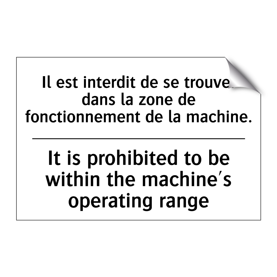 Panneau d'interdiction bilingue avec texte en français : "Il est interdit de se trouver dans la zone de fonctionnement de la machine.", et en anglais : "It is prohibited to be within the machine's operating range"