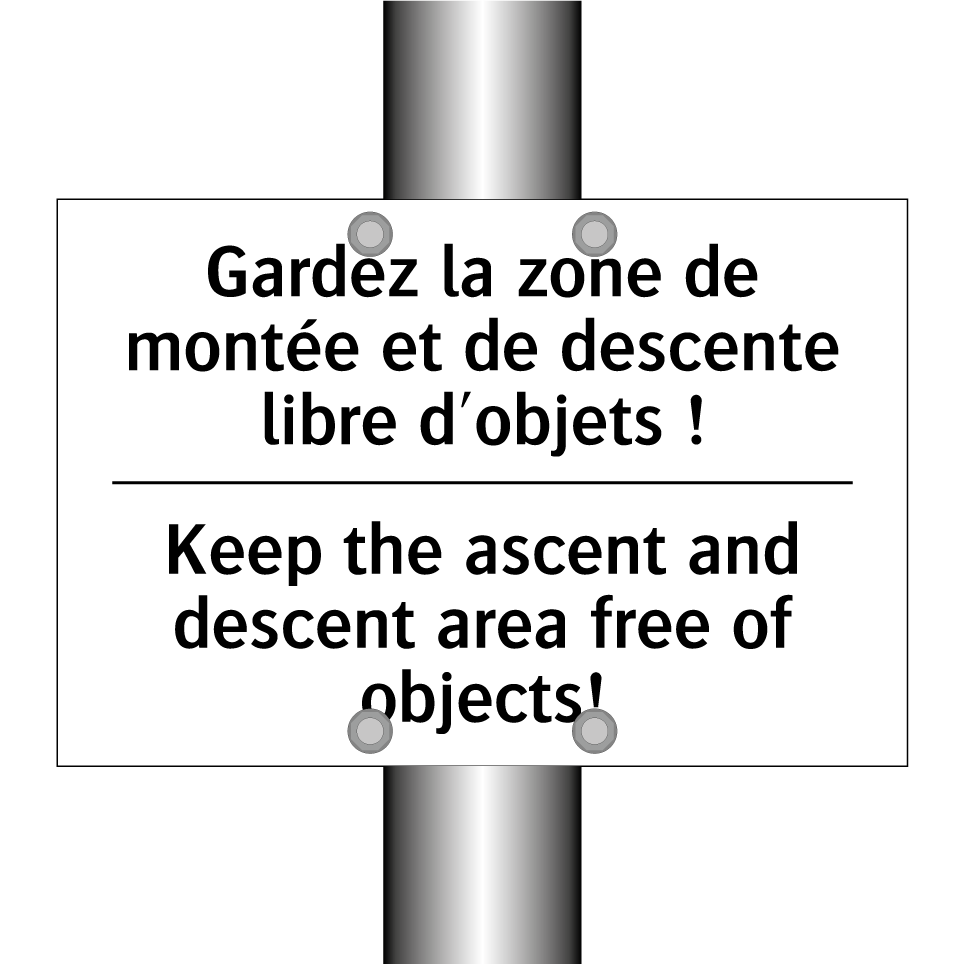 Panneau d'interdiction bilingue avec texte en français : "Gardez la zone de montée et de descente libre d'objets !", et en anglais : "Keep the ascent and descent area free of objects!"