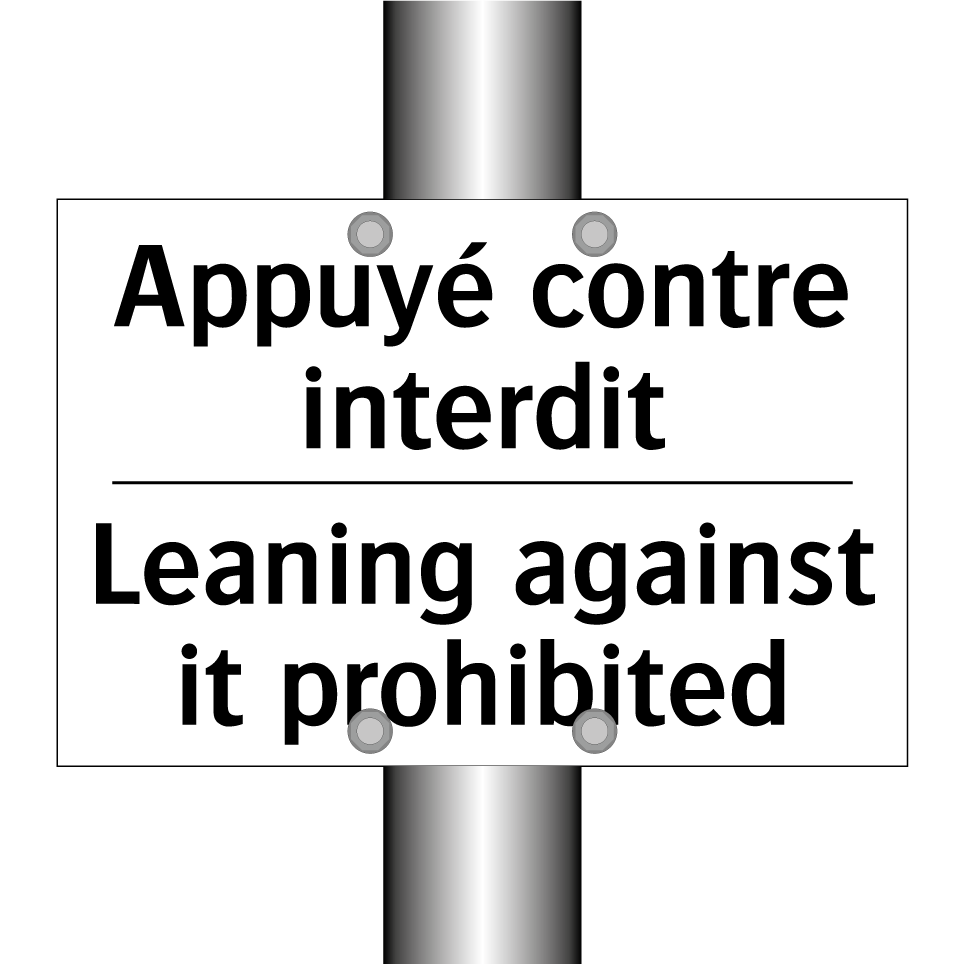 Panneau d'interdiction bilingue avec texte en français : "Appuyé contre interdit", et en anglais : "Leaning against it prohibited"