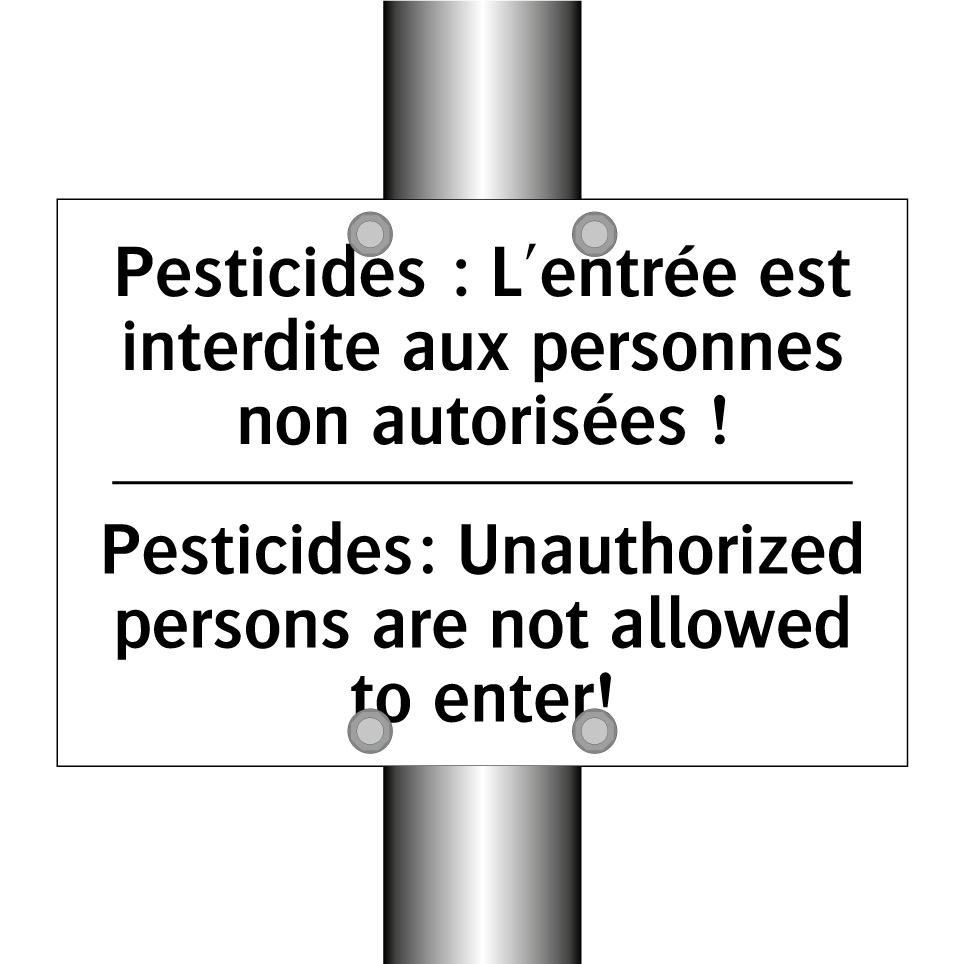 Panneau d'interdiction bilingue avec texte en français : "Pesticides : L'entrée est interdite aux personnes non autorisées !", et en anglais : "Pesticides: Unauthorized persons are not allowed to enter!"