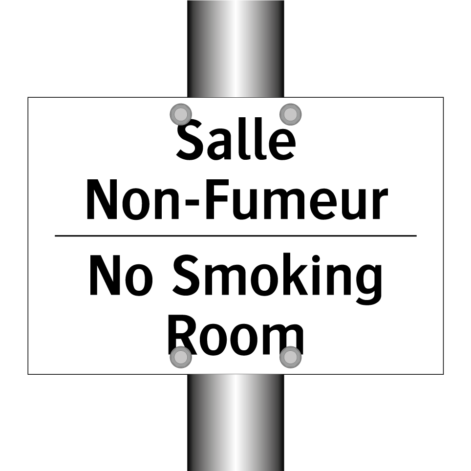Panneau d'interdiction bilingue avec texte en français : "Salle Non-Fumeur", et en anglais : "No Smoking Room"