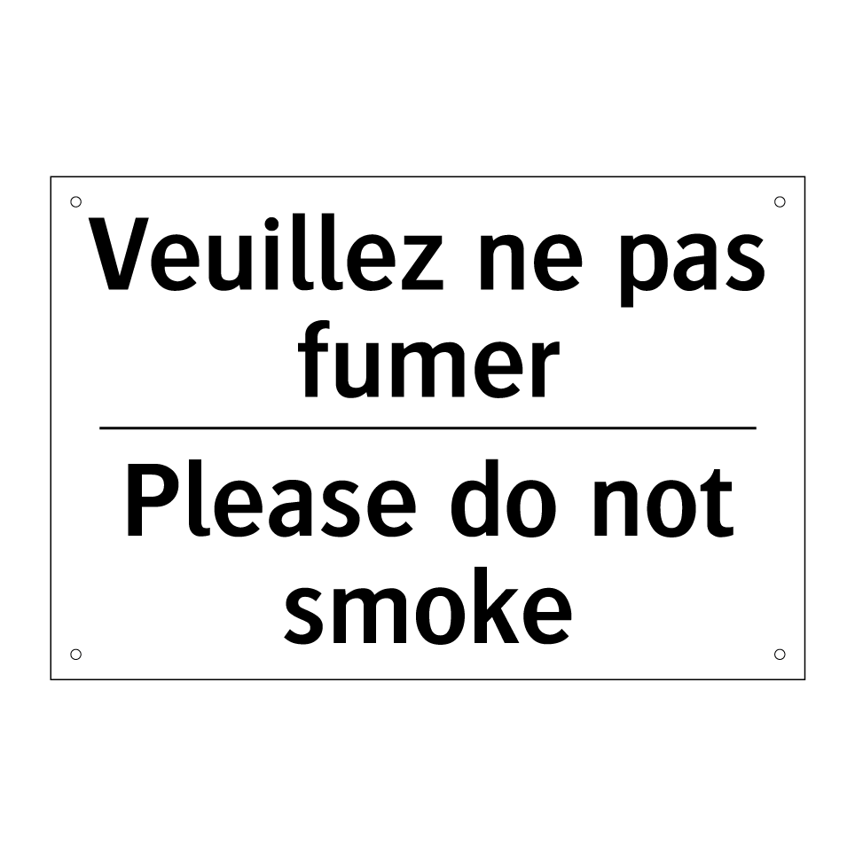 Panneau d'interdiction bilingue avec texte en français : "Veuillez ne pas fumer", et en anglais : "Please do not smoke"