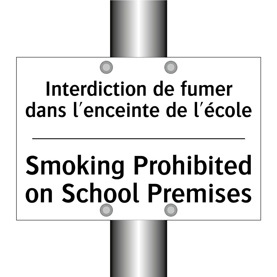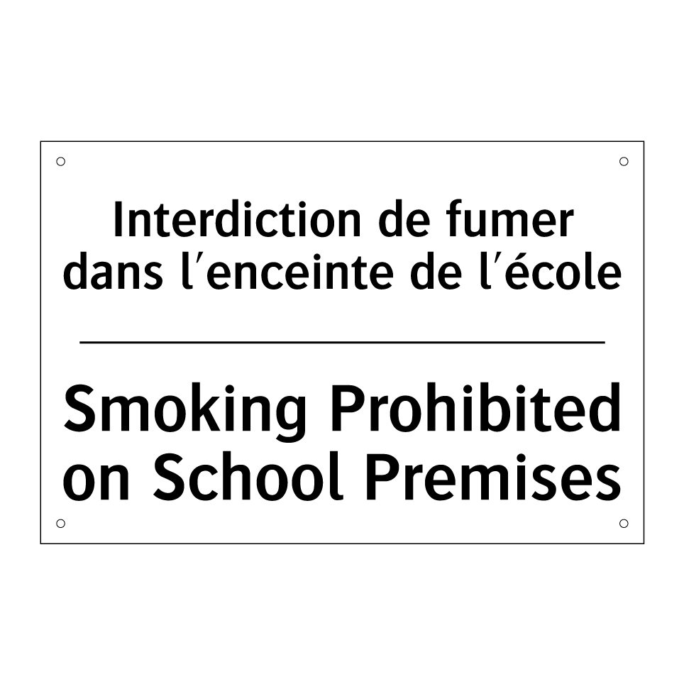 Panneau d'interdiction bilingue avec texte en français : "Interdiction de fumer dans l'enceinte de l'école", et en anglais : "Smoking Prohibited on School Premises"