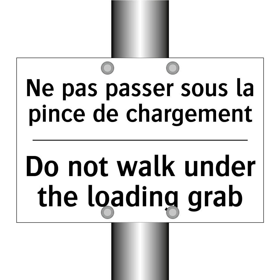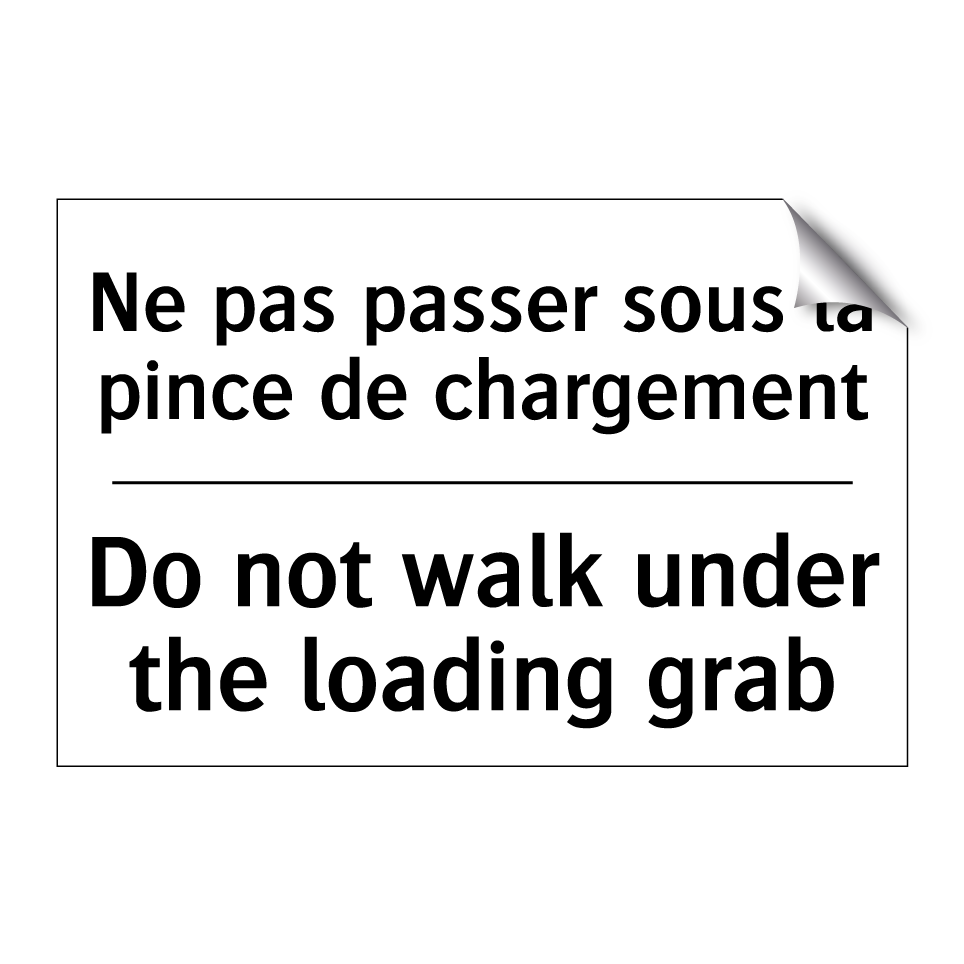 Panneau d'interdiction bilingue avec texte en français : "Ne pas passer sous la pince de chargement", et en anglais : "Do not walk under the loading grab"