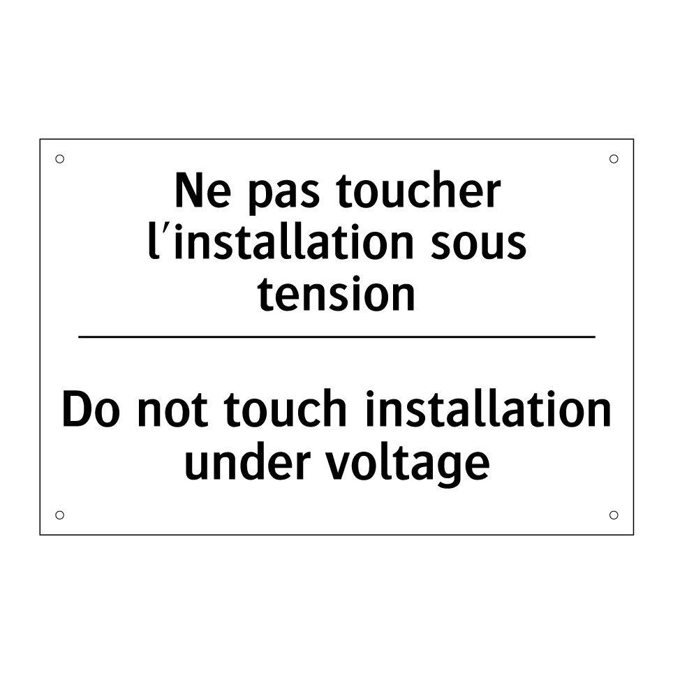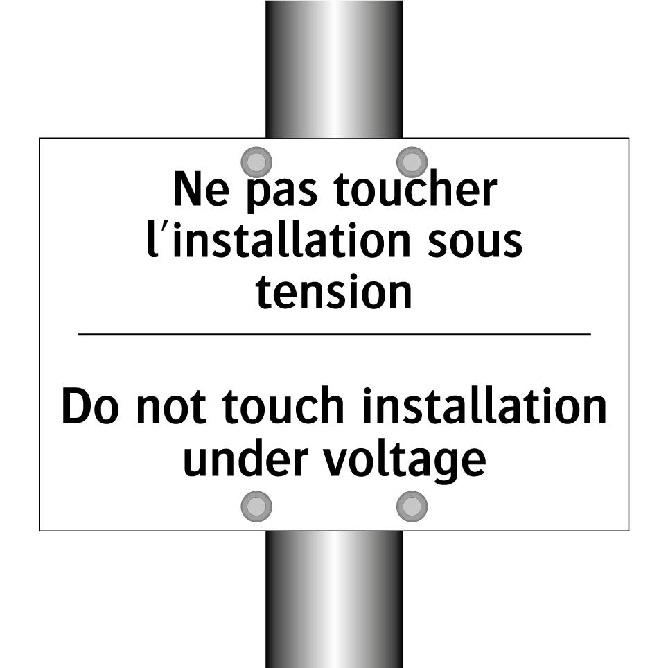 Panneau d'interdiction bilingue avec texte en français : "Ne pas toucher l'installation sous tension", et en anglais : "Do not touch installation under voltage"