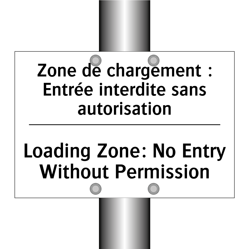 Panneau d'interdiction bilingue avec texte en français : "Zone de chargement : Entrée interdite sans autorisation", et en anglais : "Loading Zone: No Entry Without Permission"