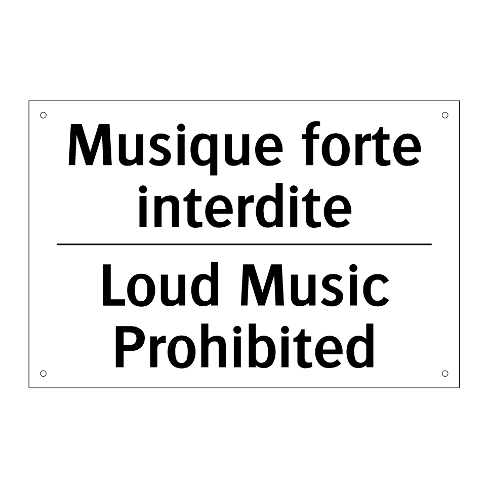 Panneau d'interdiction bilingue avec texte en français : "Musique forte interdite", et en anglais : "Loud Music Prohibited"