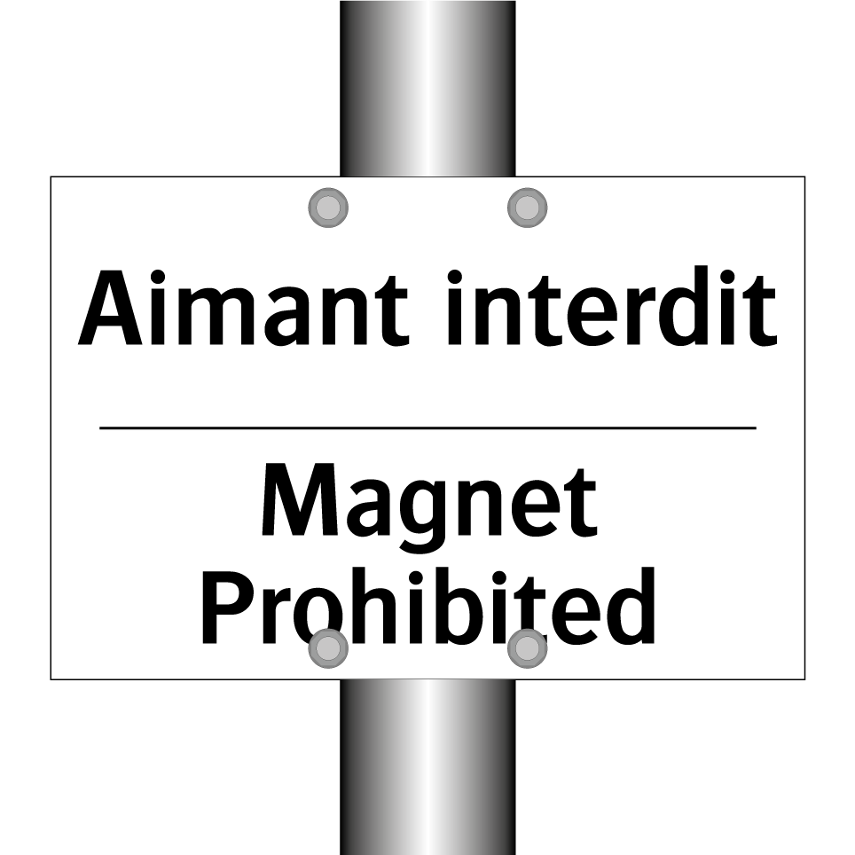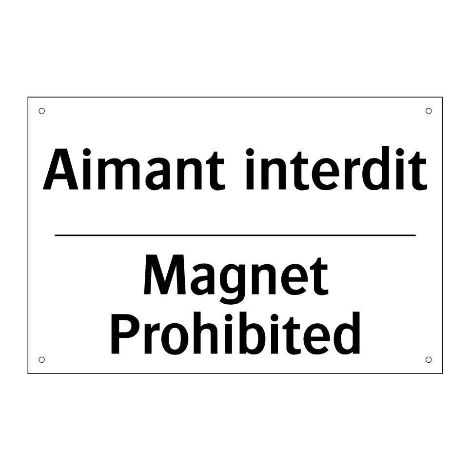 Panneau d'interdiction bilingue avec texte en français : "Aimant interdit", et en anglais : "Magnet Prohibited"