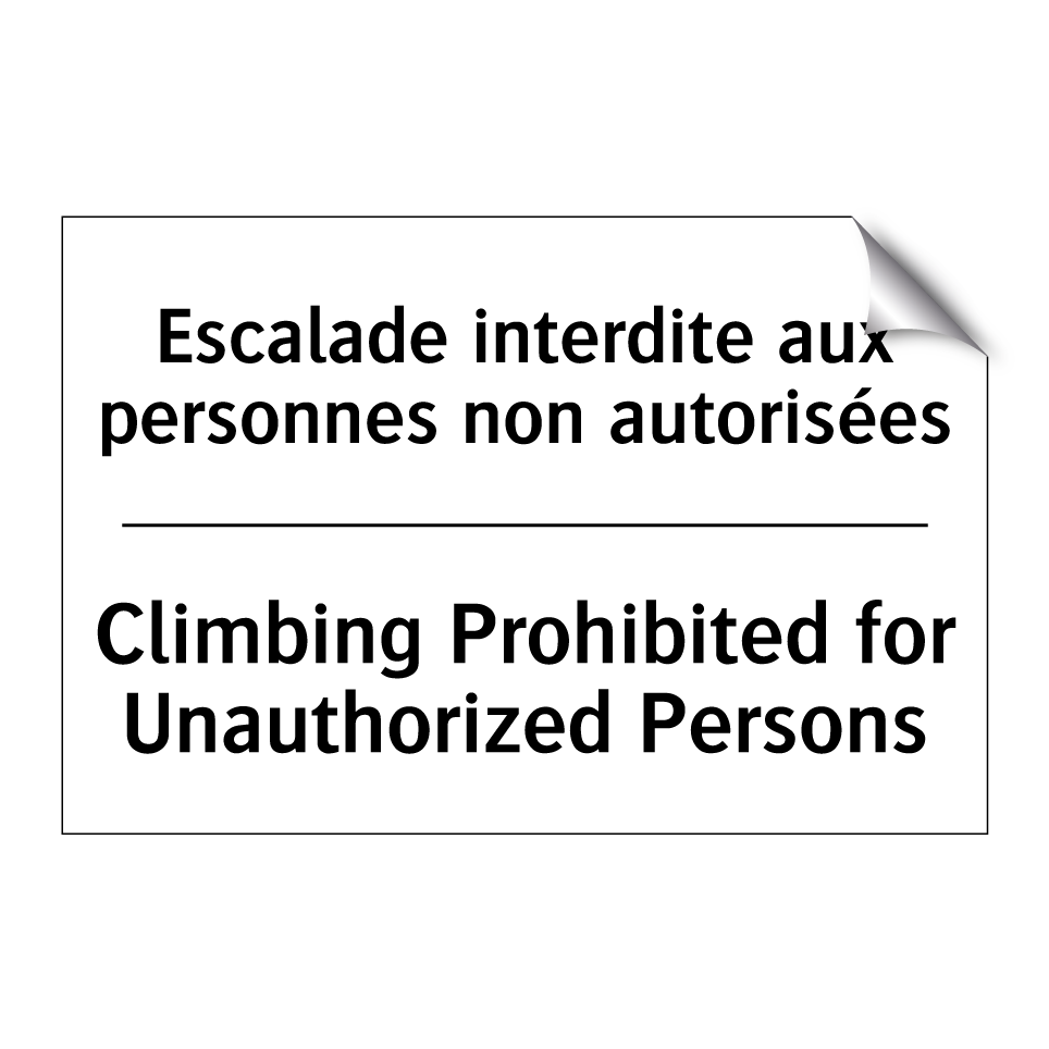 Panneau d'interdiction bilingue avec texte en français : "Escalade interdite aux personnes non autorisées", et en anglais : "Climbing Prohibited for Unauthorized Persons"