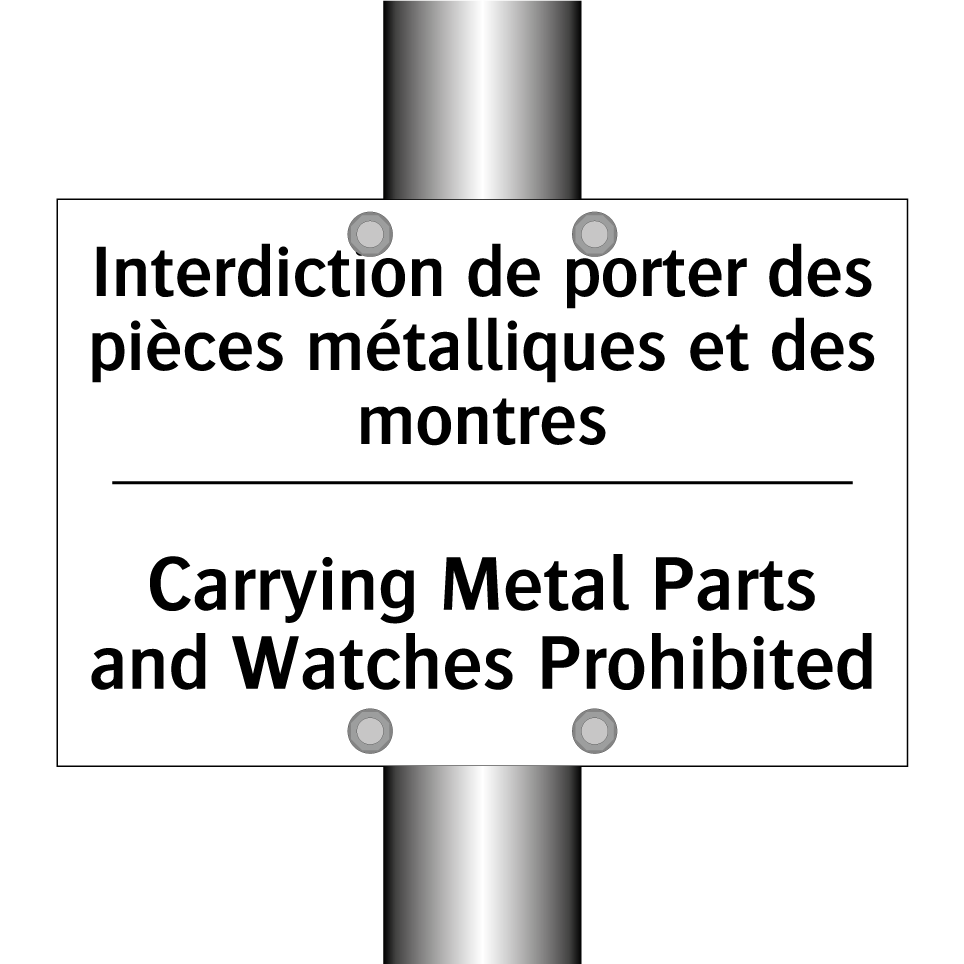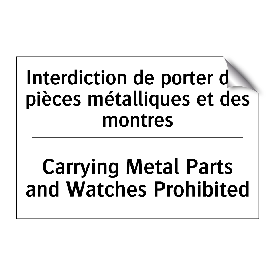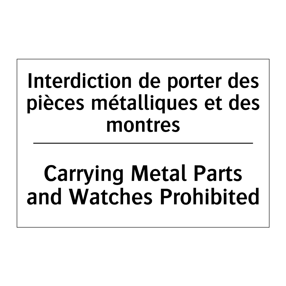 Panneau d'interdiction bilingue avec texte en français : "Interdiction de porter des pièces métalliques et des montres", et en anglais : "Carrying Metal Parts and Watches Prohibited"
