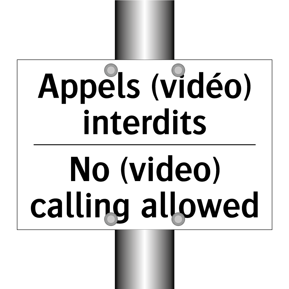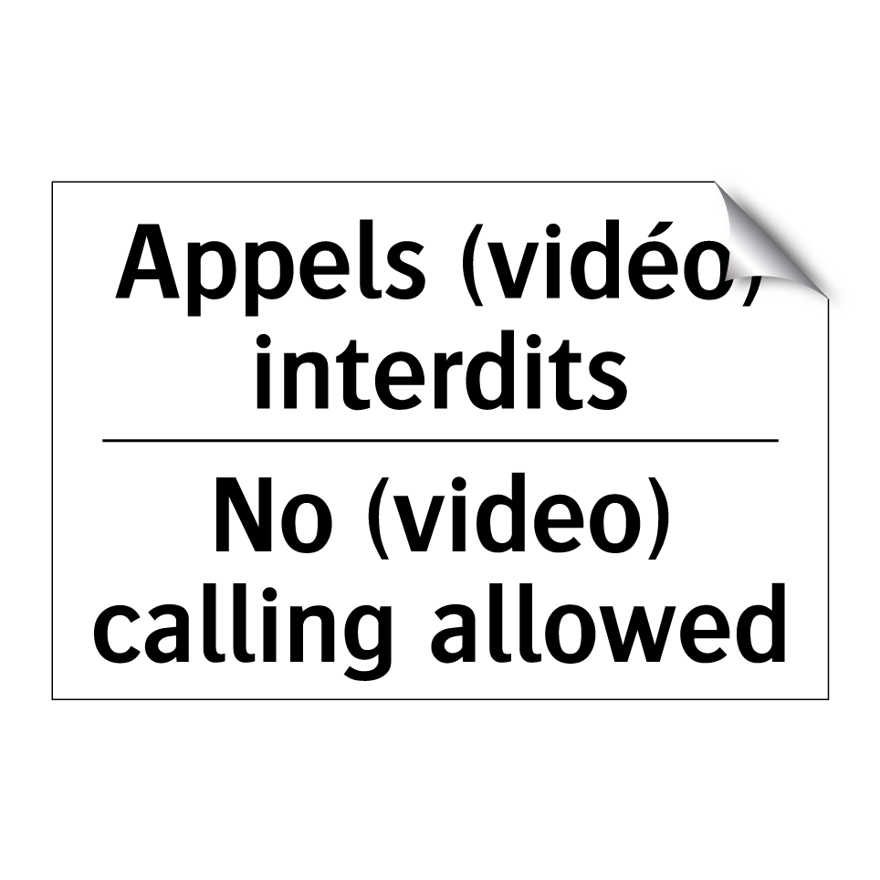 Panneau d'interdiction bilingue avec texte en français : "Appels (vidéo) interdits", et en anglais : "No (video) calling allowed"