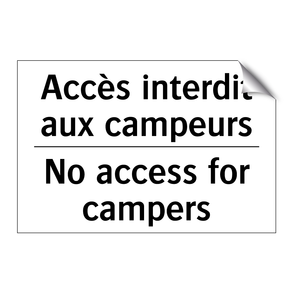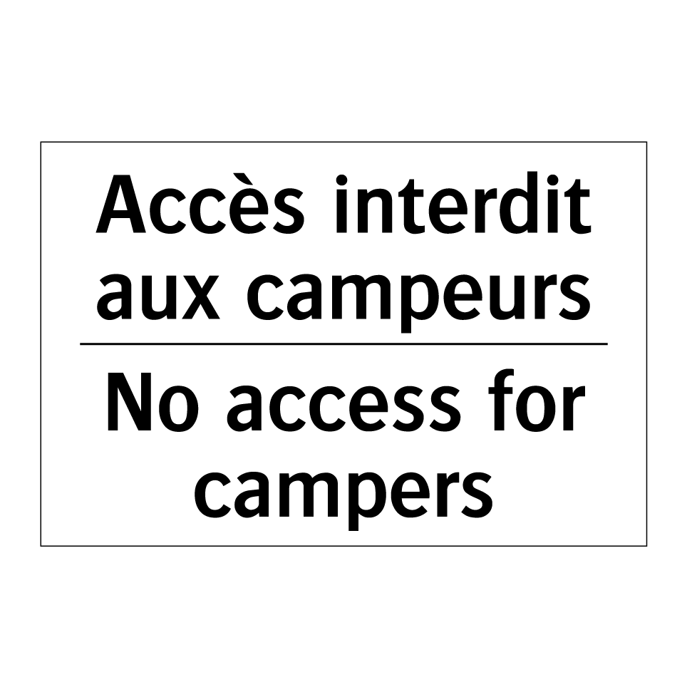 Panneau d'interdiction bilingue avec texte en français : "Accès interdit aux campeurs", et en anglais : "No access for campers"