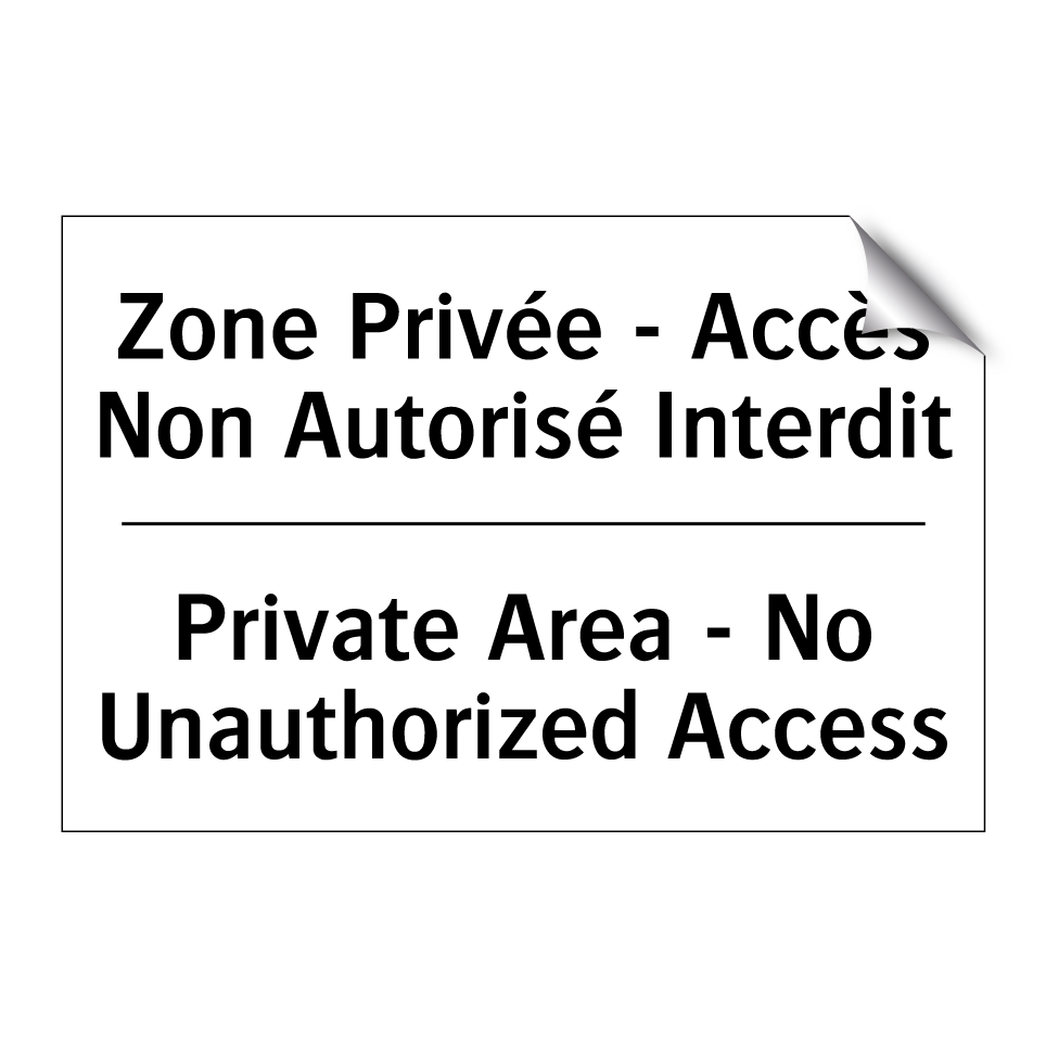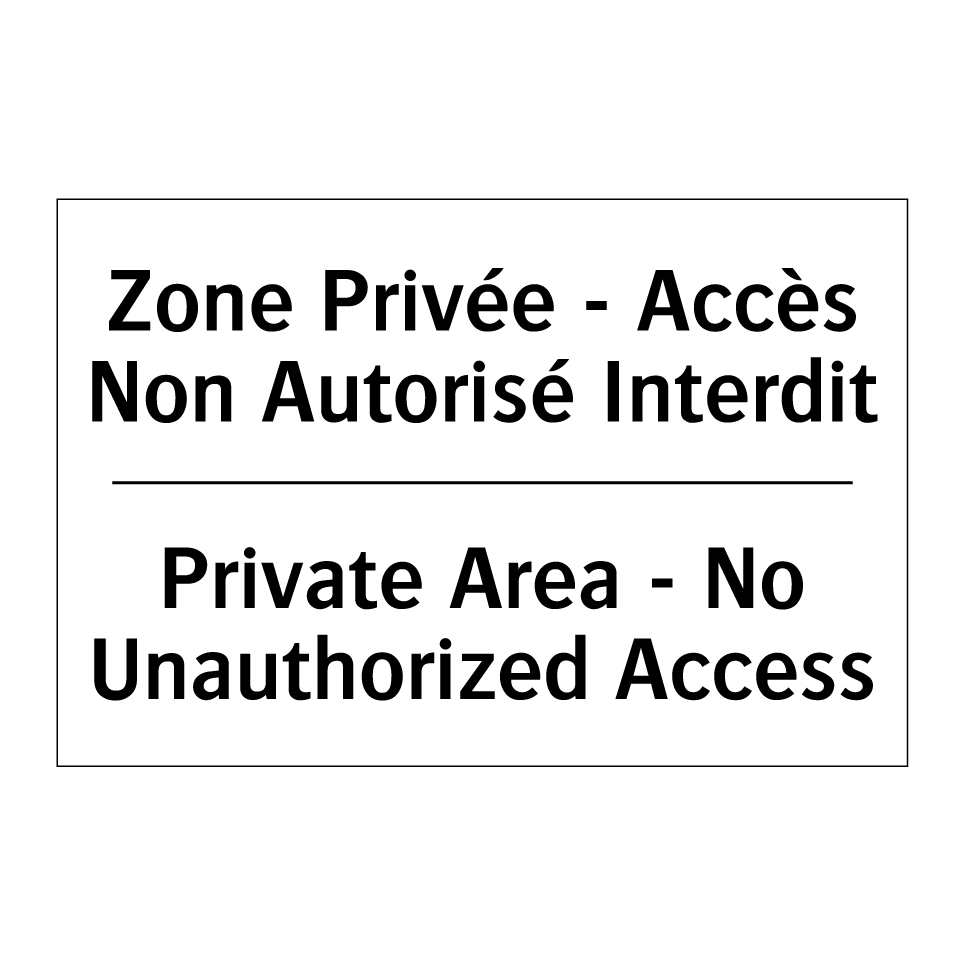Panneau d'interdiction bilingue avec texte en français : "Zone Privée - Accès Non Autorisé Interdit", et en anglais : "Private Area - No Unauthorized Access"
