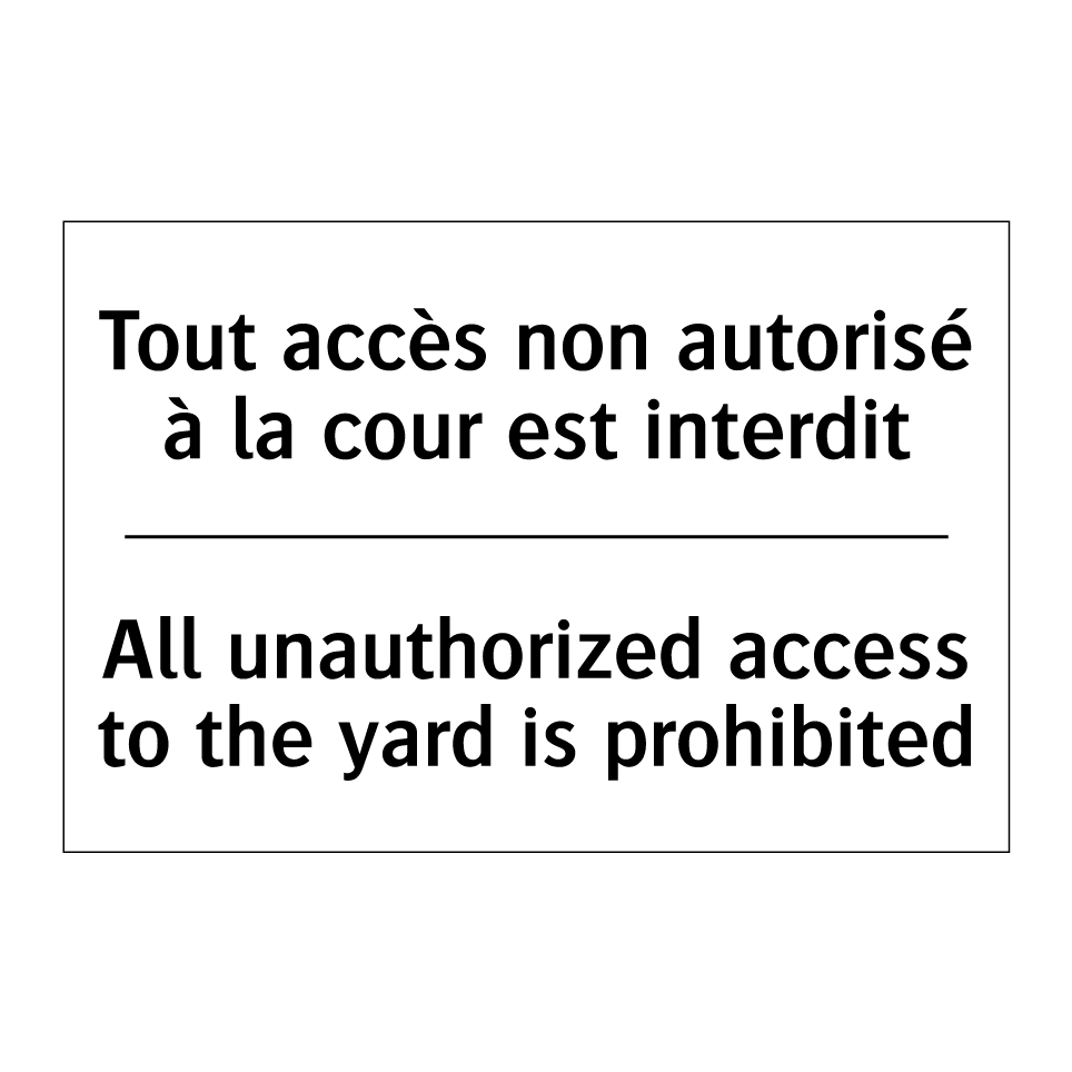 Panneau d'interdiction bilingue avec texte en français : "Tout accès non autorisé à la cour est interdit", et en anglais : "All unauthorized access to the yard is prohibited"