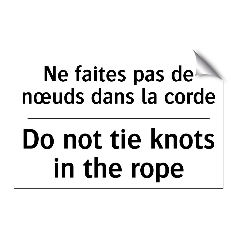 Panneau d'interdiction bilingue avec texte en français : "Ne faites pas de nœuds dans la corde", et en anglais : "Do not tie knots in the rope"