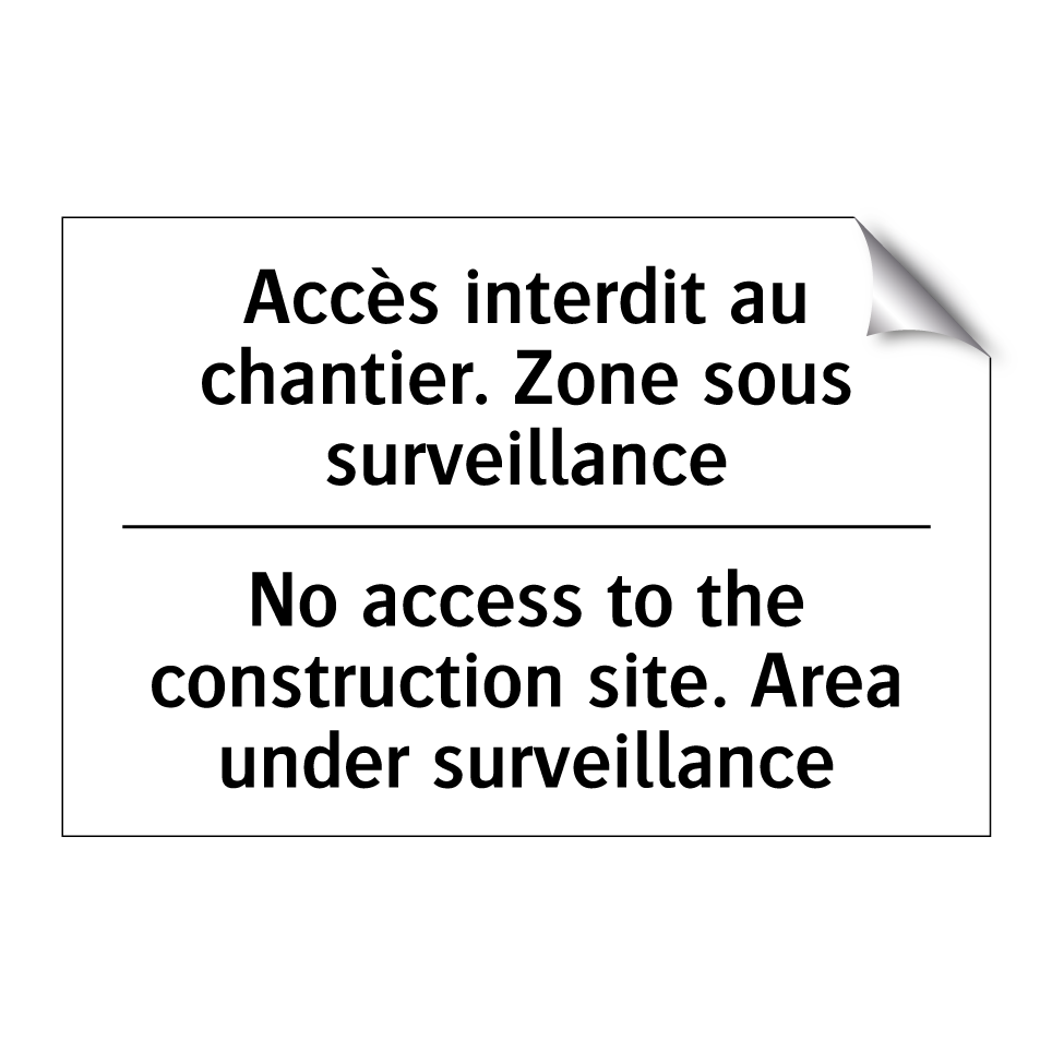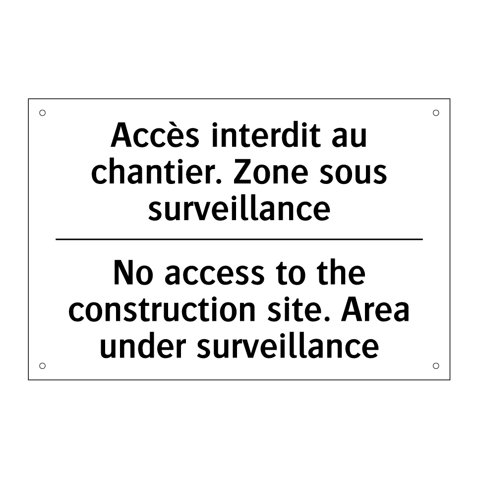 Panneau d'interdiction bilingue avec texte en français : "Accès interdit au chantier. Zone sous surveillance", et en anglais : "No access to the construction site. Area under surveillance"