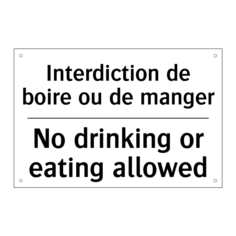 Panneau d'interdiction bilingue avec texte en français : "Interdiction de boire ou de manger", et en anglais : "No drinking or eating allowed"