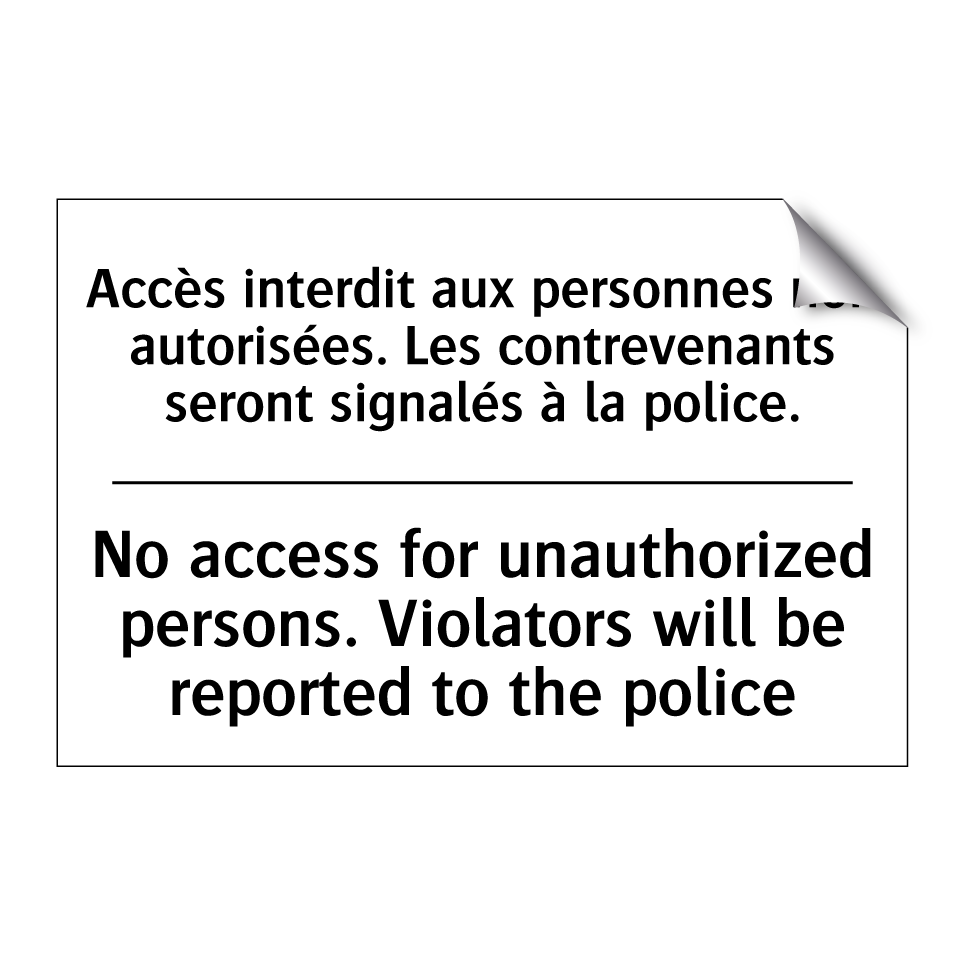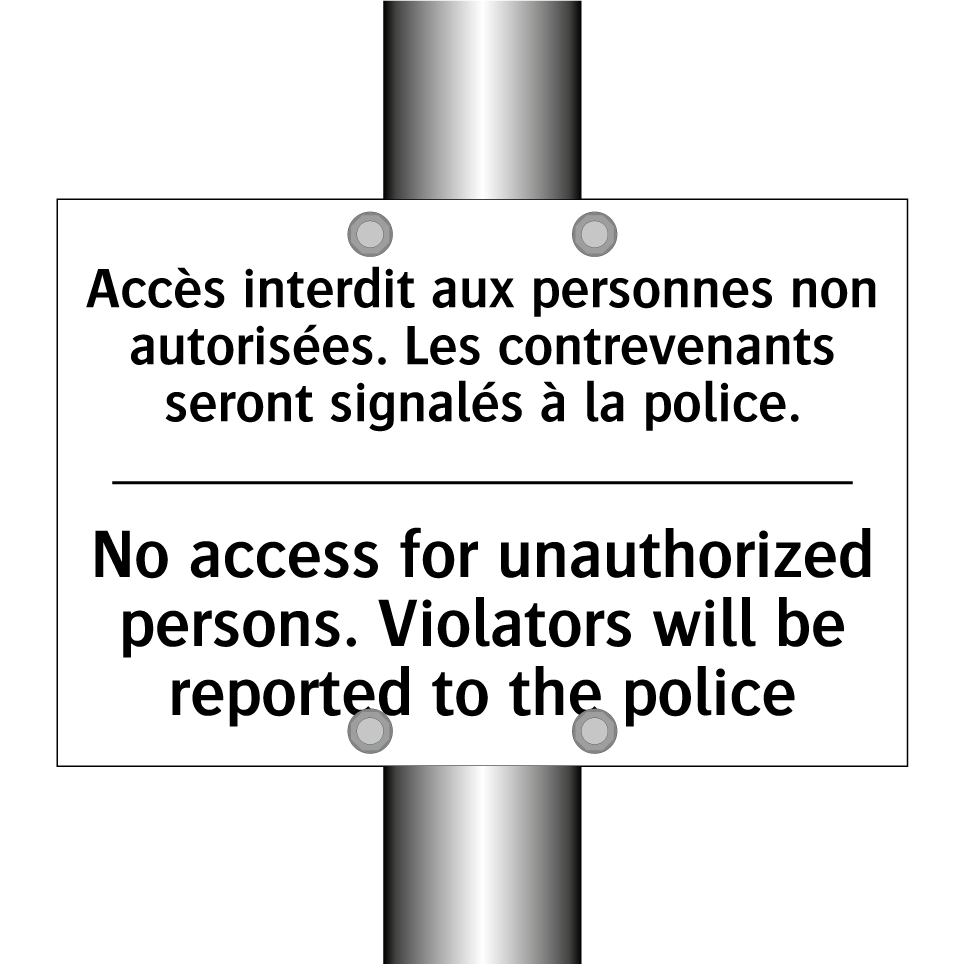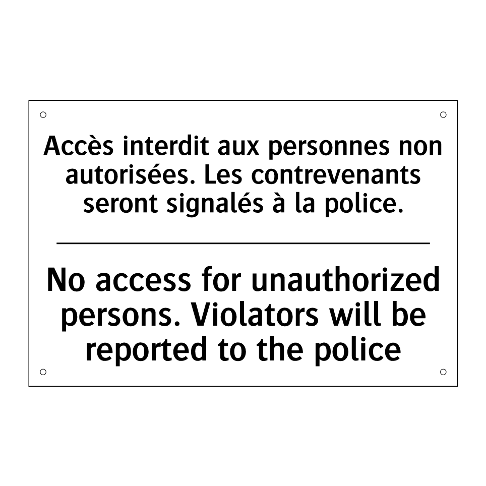 Panneau d'interdiction bilingue avec texte en français : "Accès interdit aux personnes non autorisées. Les contrevenants seront signalés à la police.", et en anglais : "No access for unauthorized persons. Violators will be reported to the police"