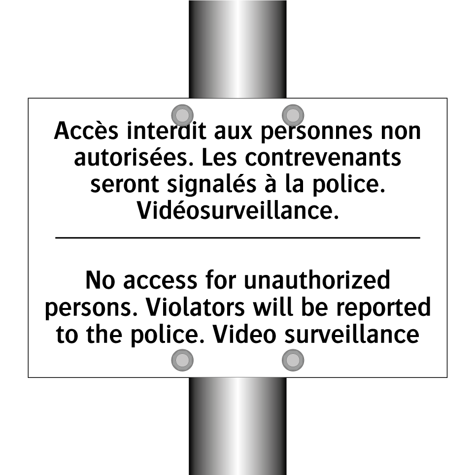 Panneau d'interdiction bilingue avec texte en français : "Accès interdit aux personnes non autorisées. Les contrevenants seront signalés à la police. Vidéosurveillance.", et en anglais : "No access for unauthorized persons. Violators will be reported to the police. Video surveillance"