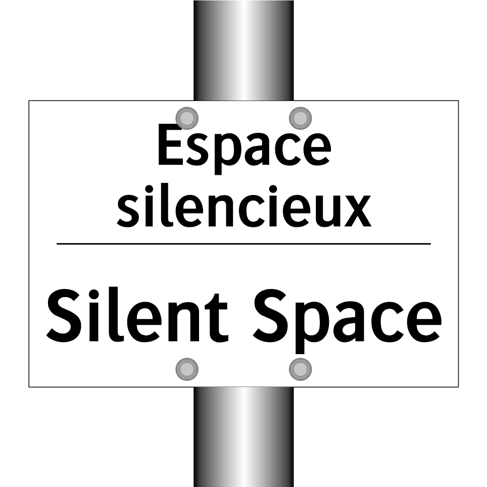 Panneau d'interdiction bilingue avec texte en français : "Espace silencieux", et en anglais : "Silent Space"