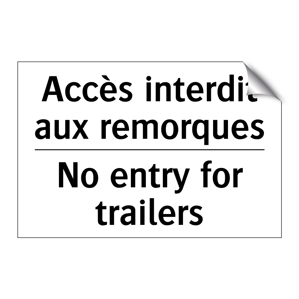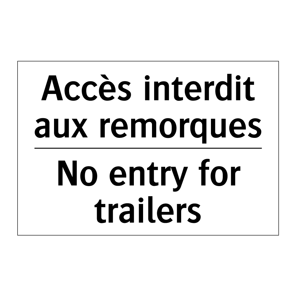 Panneau d'interdiction bilingue avec texte en français : "Accès interdit aux remorques", et en anglais : "No entry for trailers"