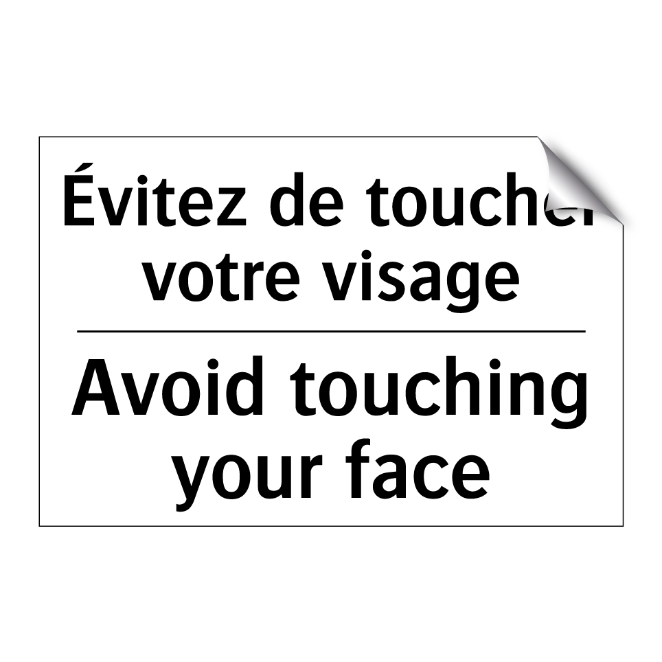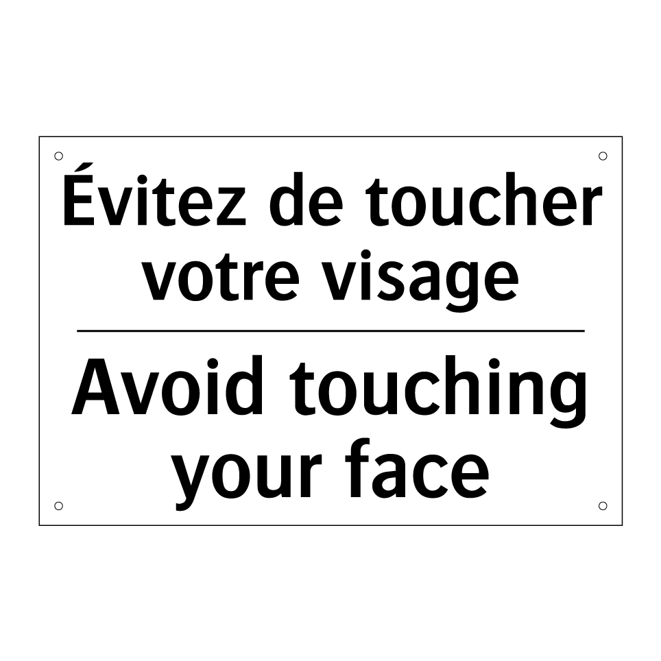 Panneau d'interdiction bilingue avec texte en français : "Évitez de toucher votre visage", et en anglais : "Avoid touching your face"