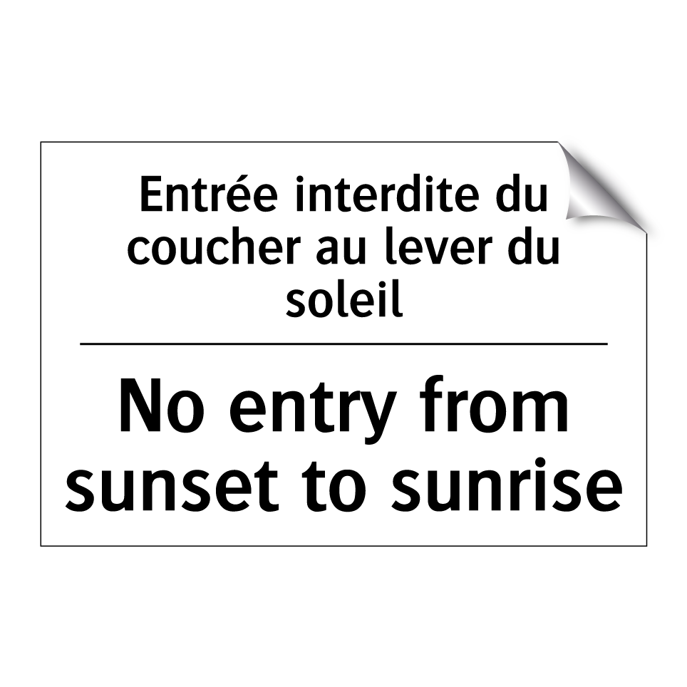 Panneau d'interdiction bilingue avec texte en français : "Entrée interdite du coucher au lever du soleil", et en anglais : "No entry from sunset to sunrise"