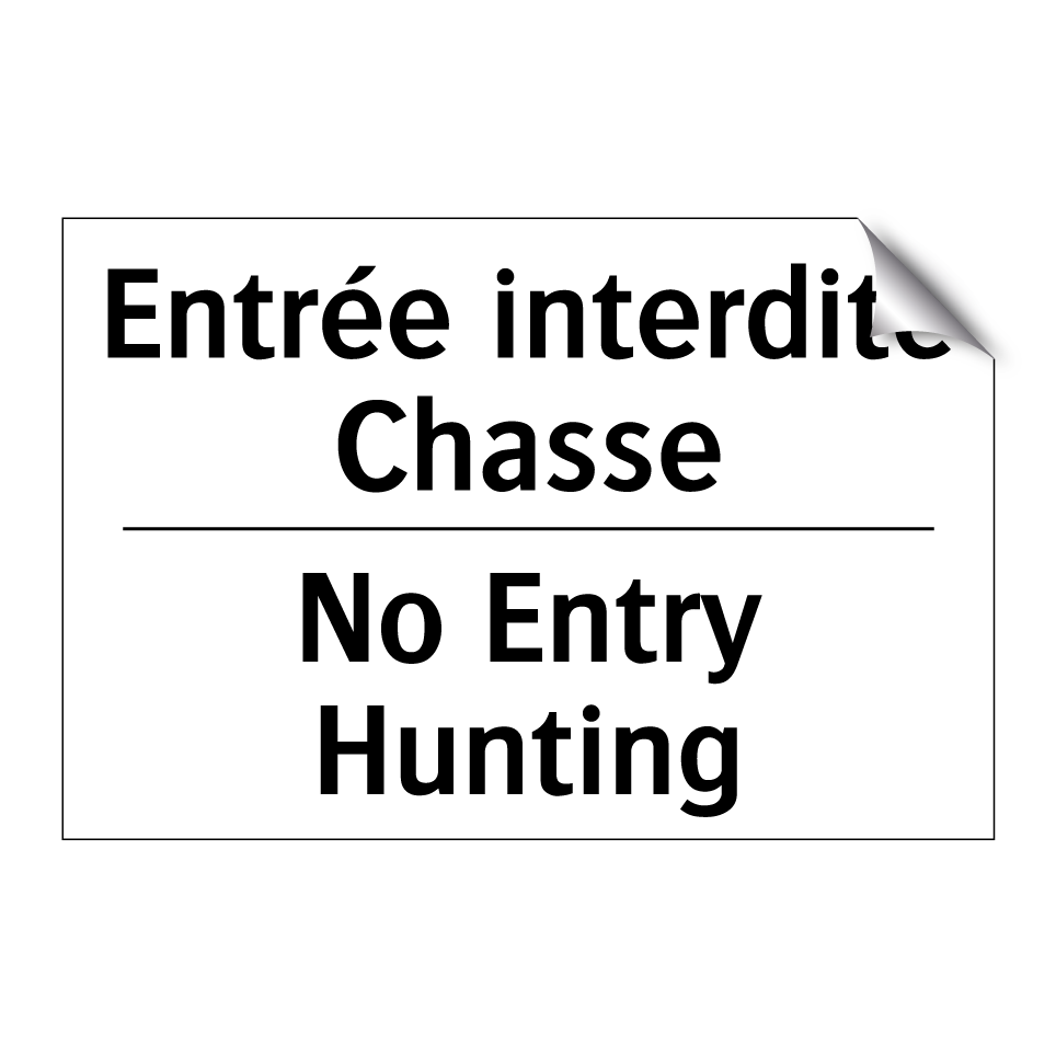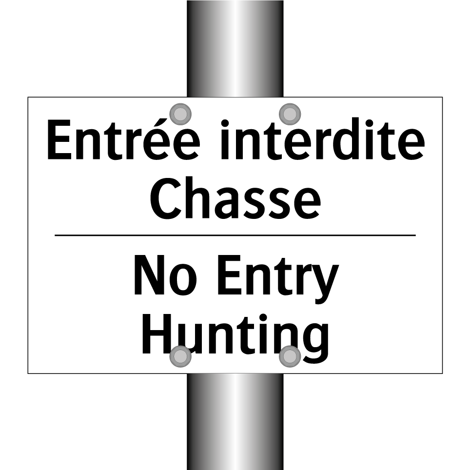 Panneau d'interdiction bilingue avec texte en français : "Entrée interdite Chasse", et en anglais : "No Entry Hunting"