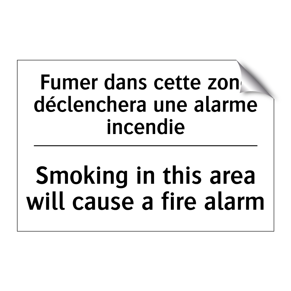 Panneau d'interdiction bilingue avec texte en français : "Fumer dans cette zone déclenchera une alarme incendie", et en anglais : "Smoking in this area will cause a fire alarm"