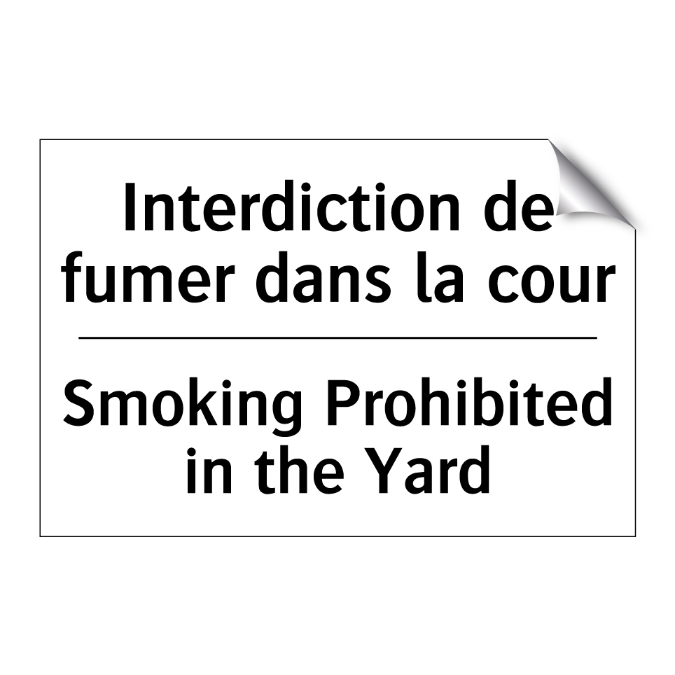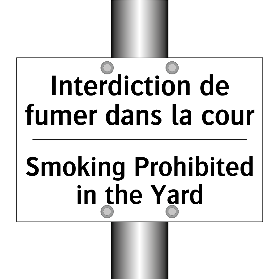 Panneau d'interdiction bilingue avec texte en français : "Interdiction de fumer dans la cour", et en anglais : "Smoking Prohibited in the Yard"
