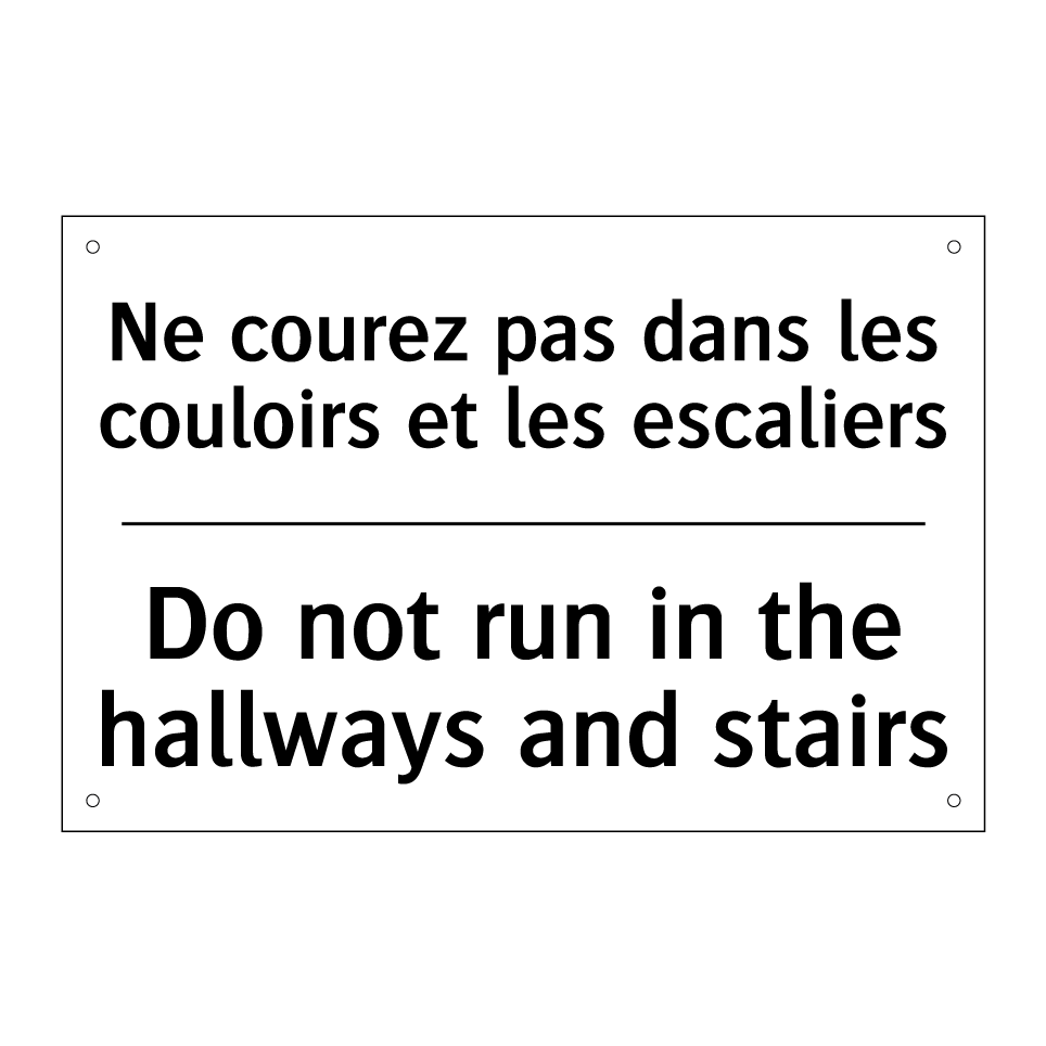 Panneau d'interdiction bilingue avec texte en français : "Ne courez pas dans les couloirs et les escaliers", et en anglais : "Do not run in the hallways and stairs"