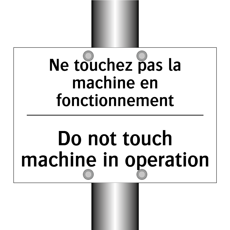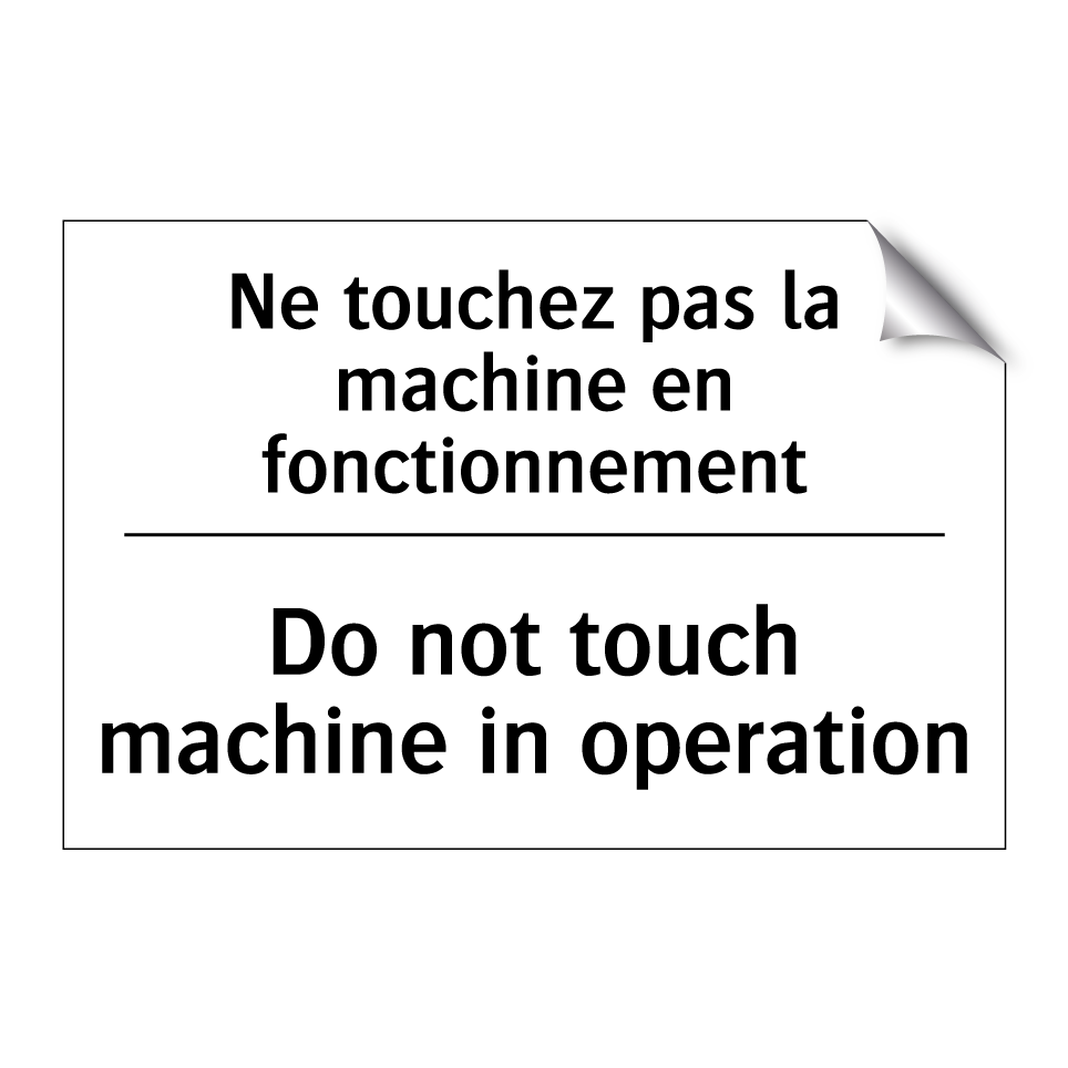 Panneau d'interdiction bilingue avec texte en français : "Ne touchez pas la machine en fonctionnement", et en anglais : "Do not touch machine in operation"