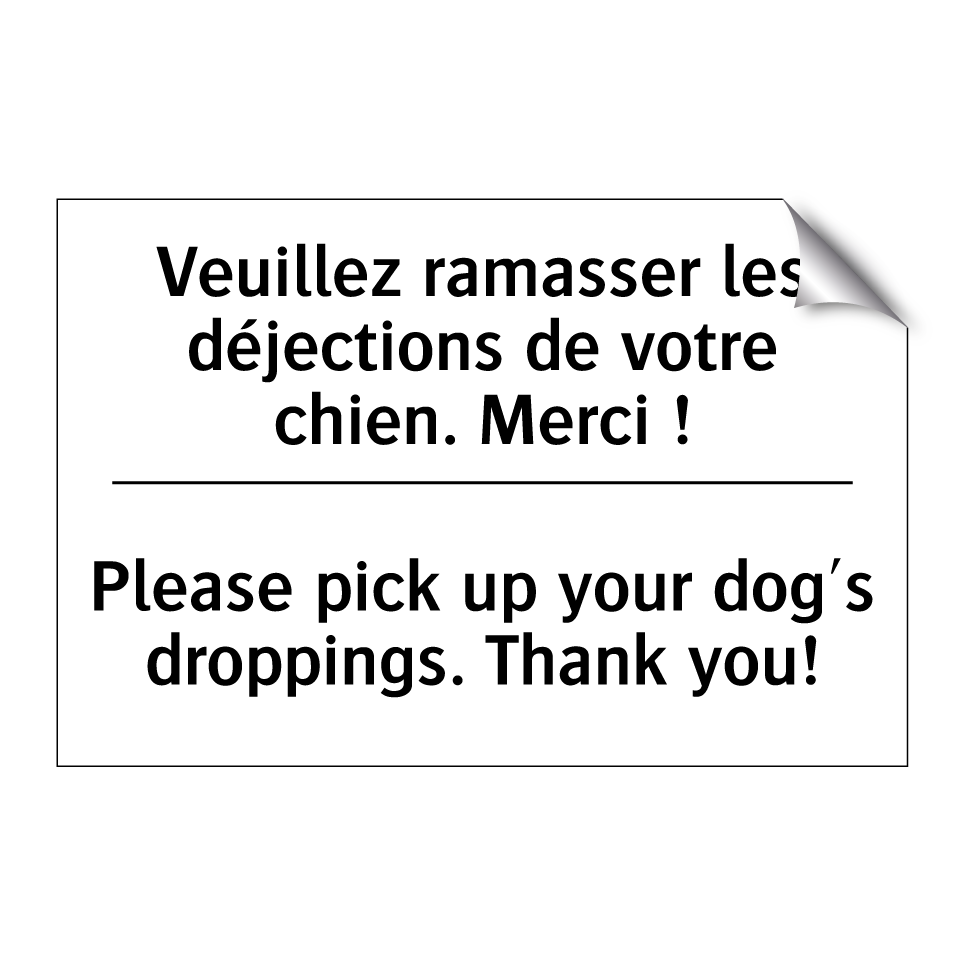 Panneau d'interdiction bilingue avec texte en français : "Veuillez ramasser les déjections de votre chien. Merci !", et en anglais : "Please pick up your dog's droppings. Thank you!"