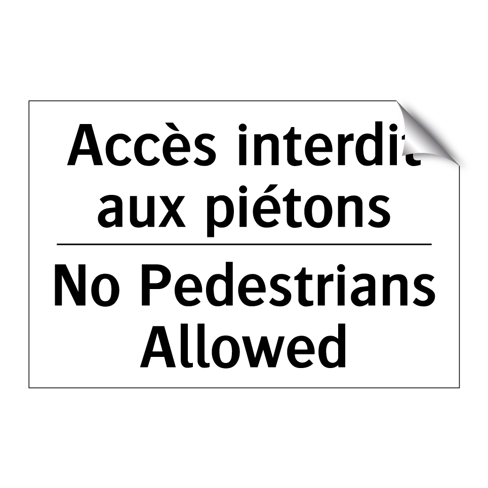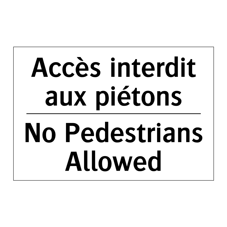Panneau d'interdiction bilingue avec texte en français : "Accès interdit aux piétons", et en anglais : "No Pedestrians Allowed"