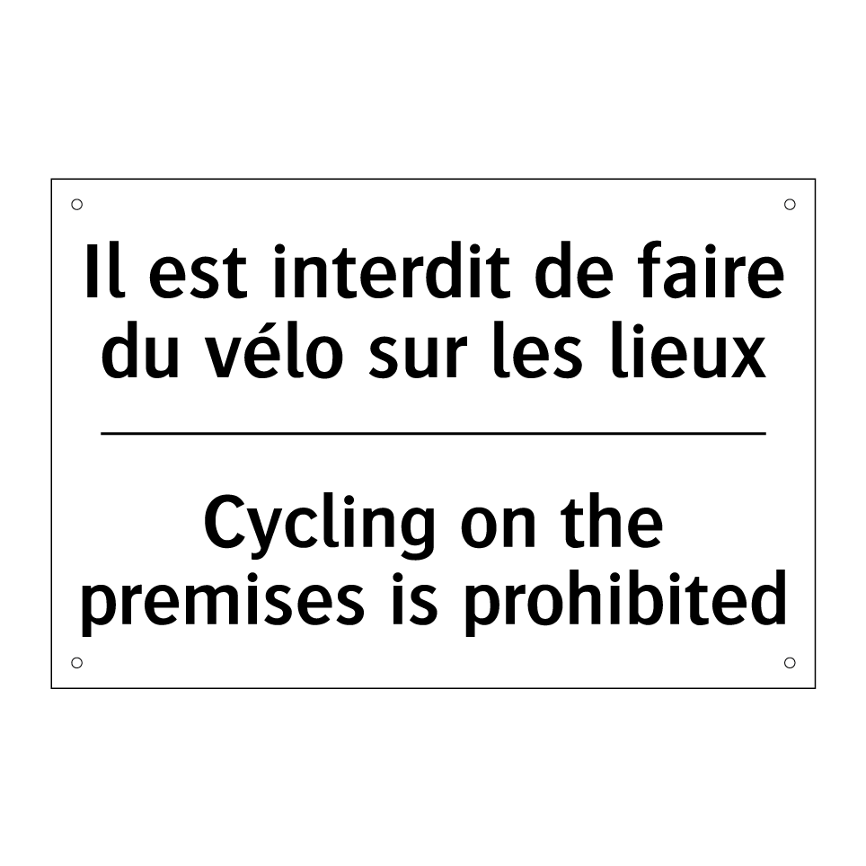 Panneau d'interdiction bilingue avec texte en français : "Il est interdit de faire du vélo sur les lieux", et en anglais : "Cycling on the premises is prohibited"