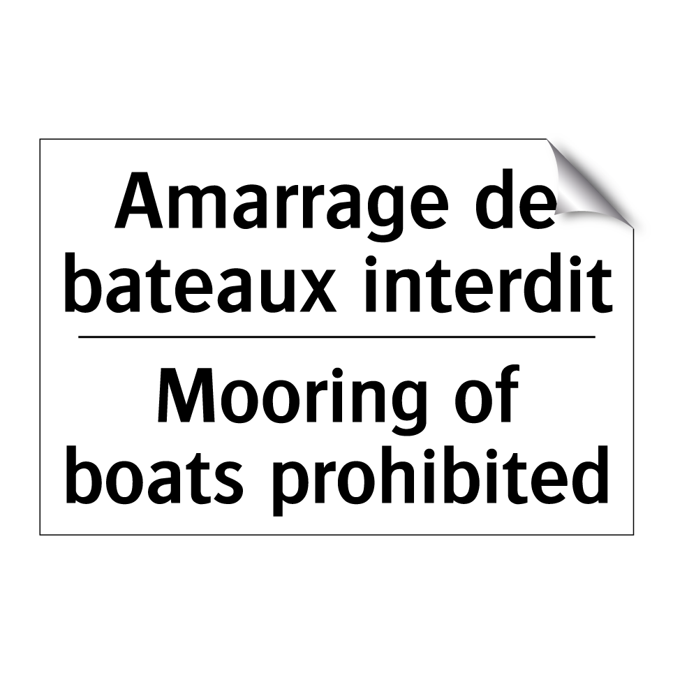 Panneau d'interdiction bilingue avec texte en français : "Amarrage de bateaux interdit", et en anglais : "Mooring of boats prohibited"