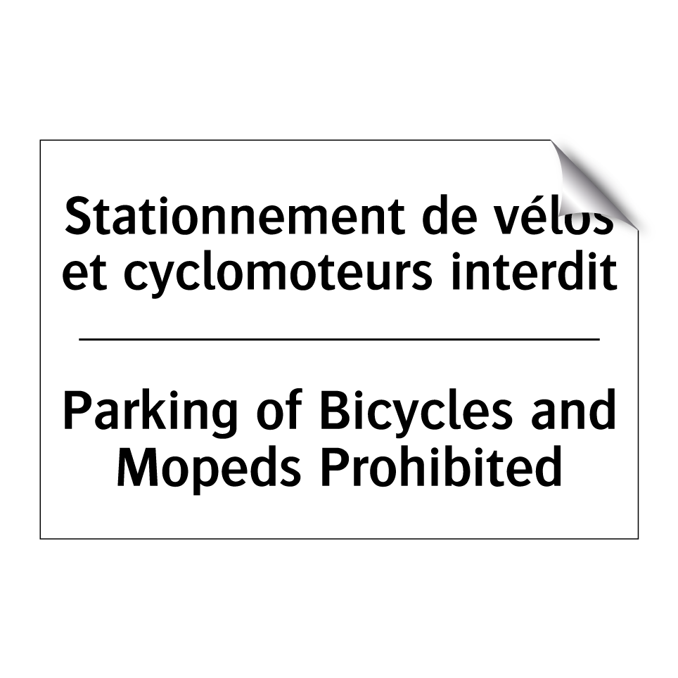 Panneau d'interdiction bilingue avec texte en français : "Stationnement de vélos et cyclomoteurs interdit", et en anglais : "Parking of Bicycles and Mopeds Prohibited"