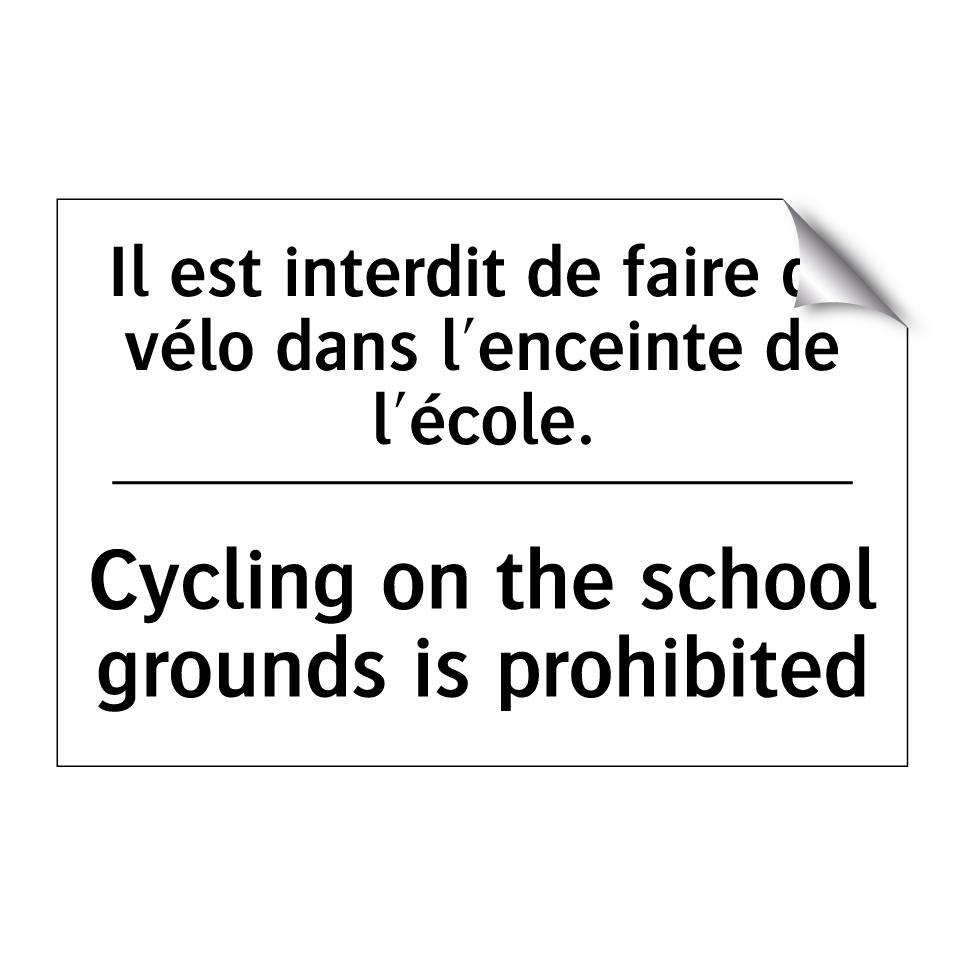 Panneau d'interdiction bilingue avec texte en français : "Il est interdit de faire du vélo dans l'enceinte de l'école.", et en anglais : "Cycling on the school grounds is prohibited"