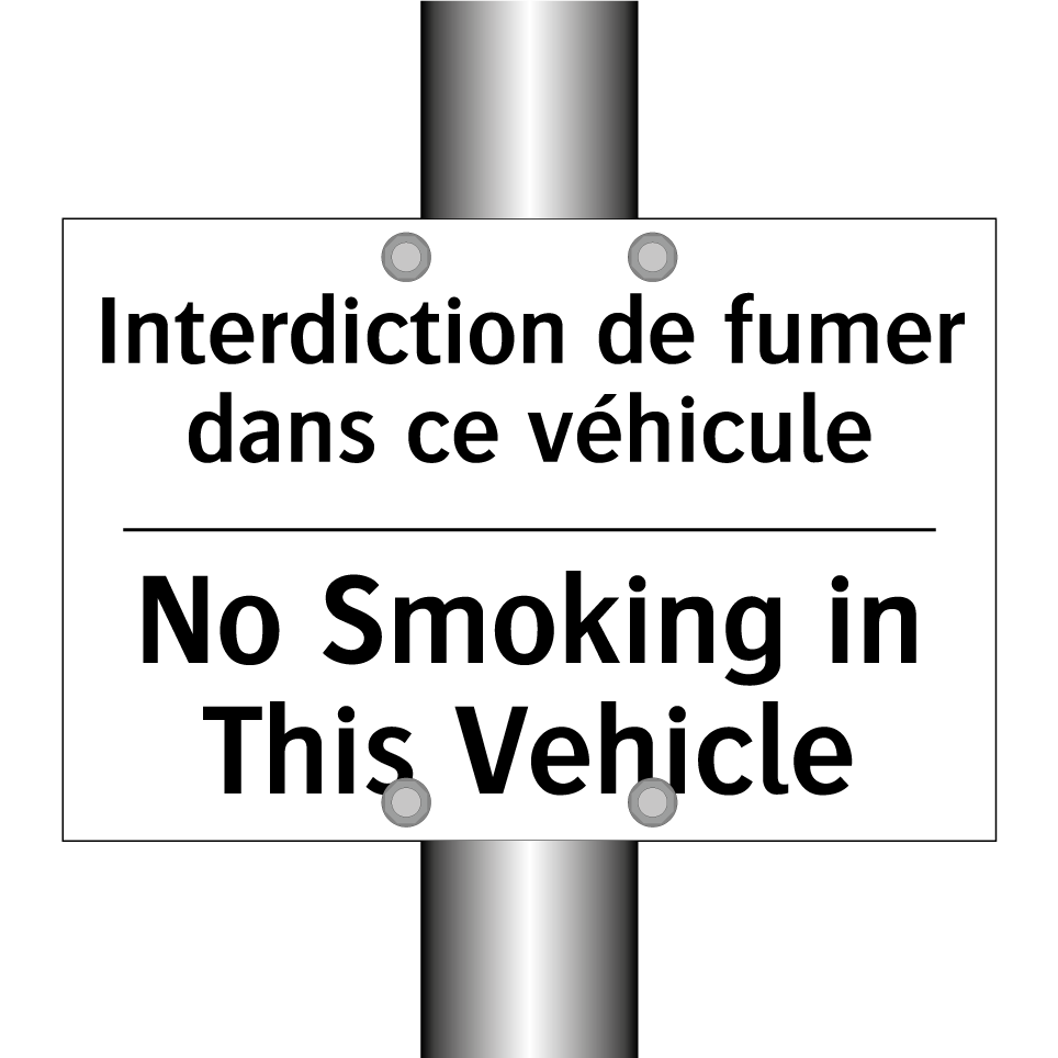 Panneau d'interdiction bilingue avec texte en français : "Interdiction de fumer dans ce véhicule", et en anglais : "No Smoking in This Vehicle"