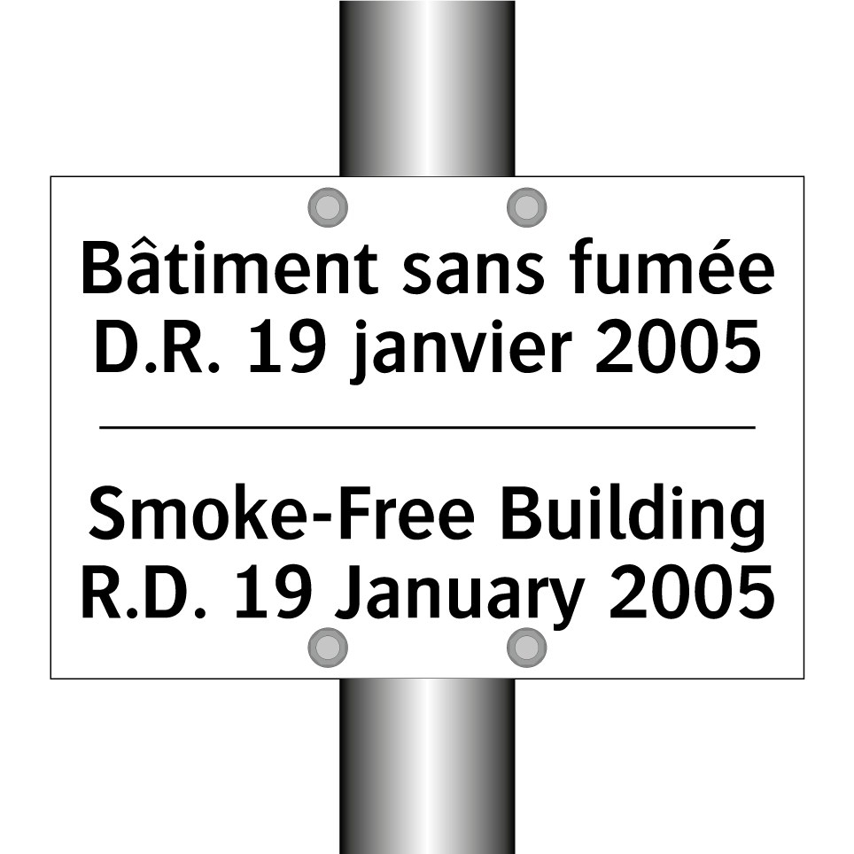 Panneau d'interdiction bilingue avec texte en français : "Bâtiment sans fumée D.R. 19 janvier 2005", et en anglais : "Smoke-Free Building R.D. 19 January 2005"