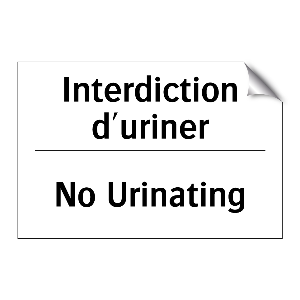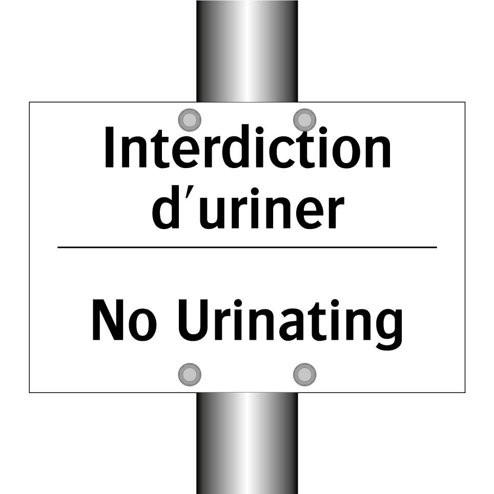 Panneau d'interdiction bilingue avec texte en français : "Interdiction d'uriner", et en anglais : "No Urinating"