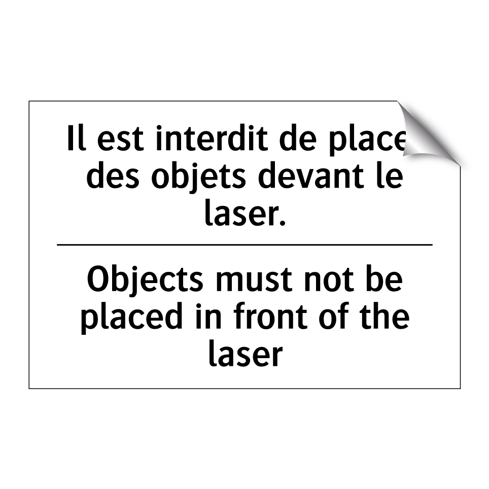 Panneau d'interdiction bilingue avec texte en français : "Il est interdit de placer des objets devant le laser.", et en anglais : "Objects must not be placed in front of the laser"