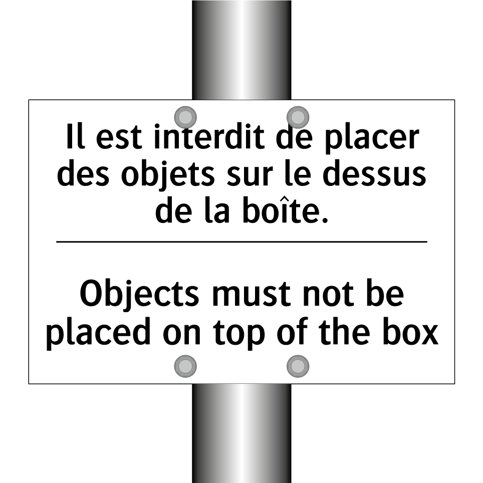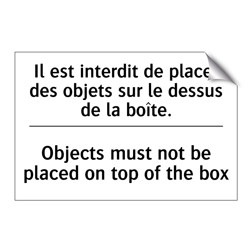 Panneau d'interdiction bilingue avec texte en français : "Il est interdit de placer des objets sur le dessus de la boîte.", et en anglais : "Objects must not be placed on top of the box"