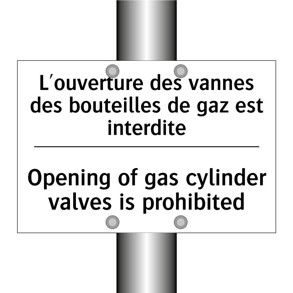 Panneau d'interdiction bilingue avec texte en français : "L'ouverture des vannes des bouteilles de gaz est interdite", et en anglais : "Opening of gas cylinder valves is prohibited"