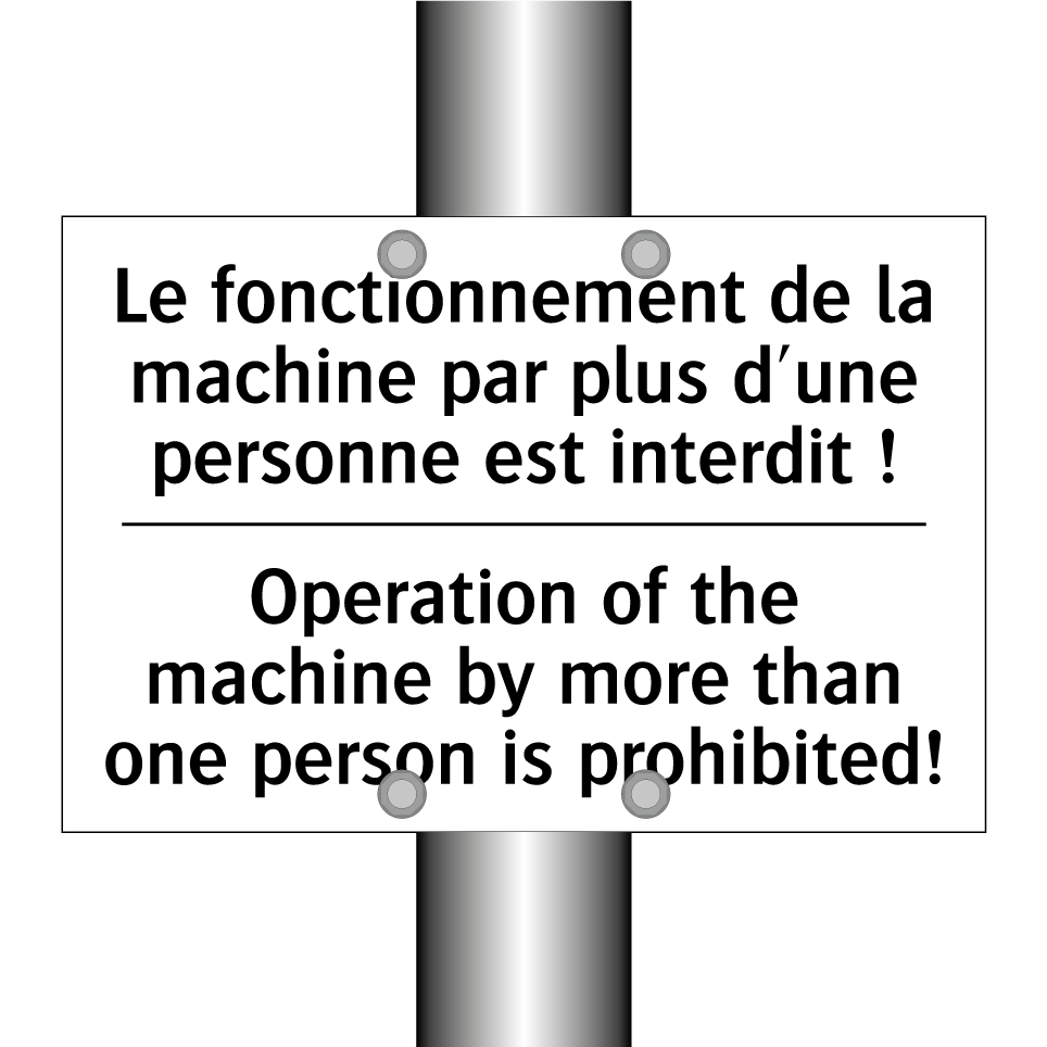 Panneau d'interdiction bilingue avec texte en français : "Le fonctionnement de la machine par plus d'une personne est interdit !", et en anglais : "Operation of the machine by more than one person is prohibited!"