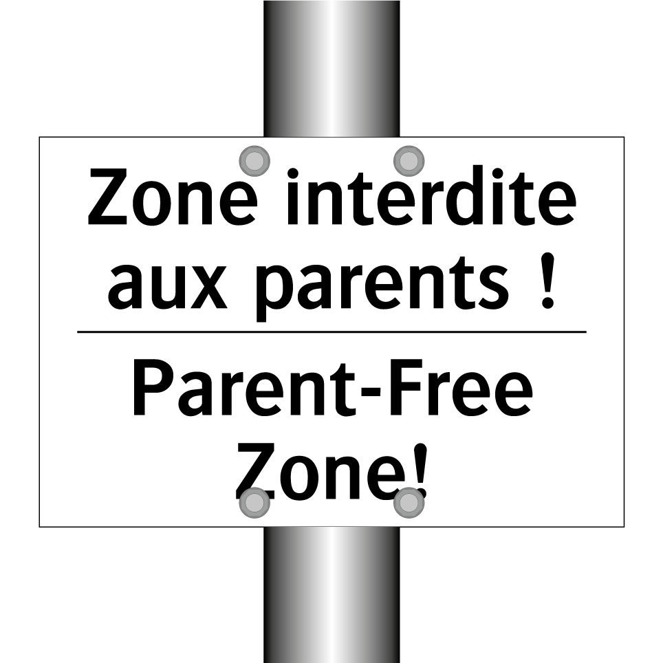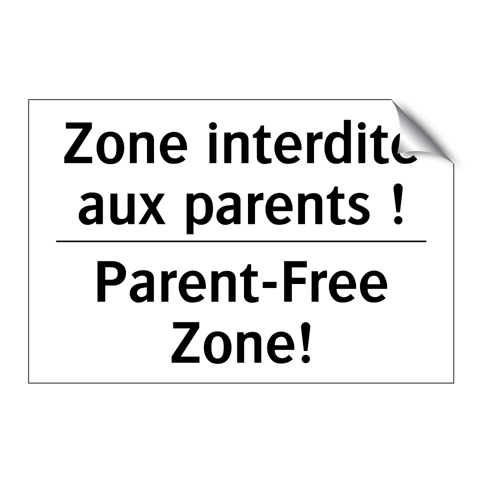 Panneau d'interdiction bilingue avec texte en français : "Zone interdite aux parents !", et en anglais : "Parent-Free Zone!"