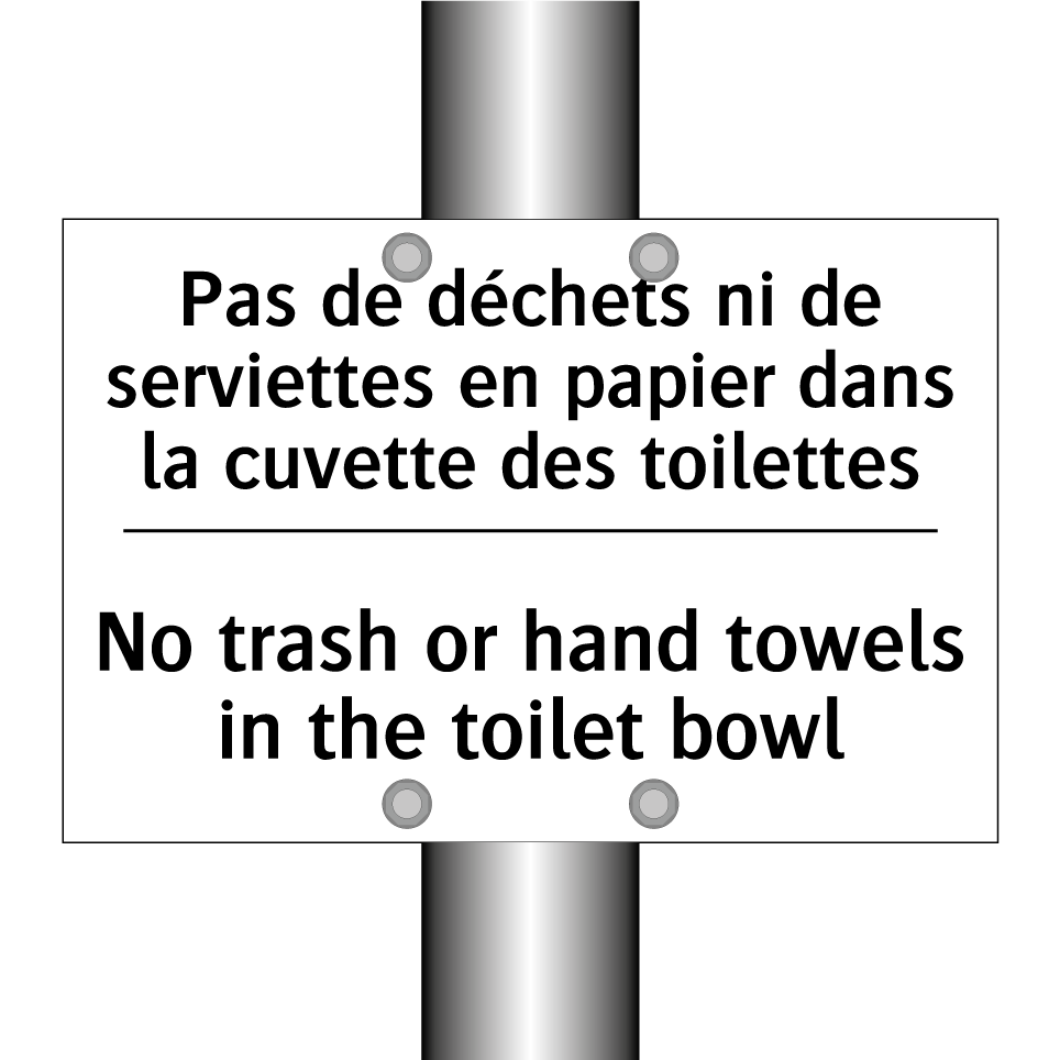 Panneau d'interdiction bilingue avec texte en français : "Pas de déchets ni de serviettes en papier dans la cuvette des toilettes", et en anglais : "No trash or hand towels in the toilet bowl"